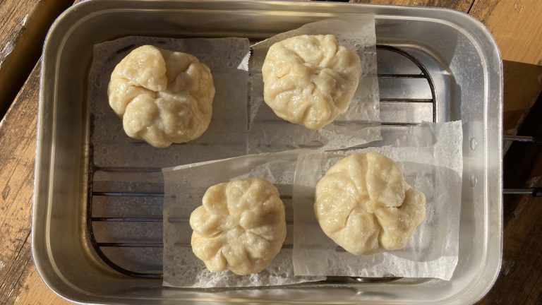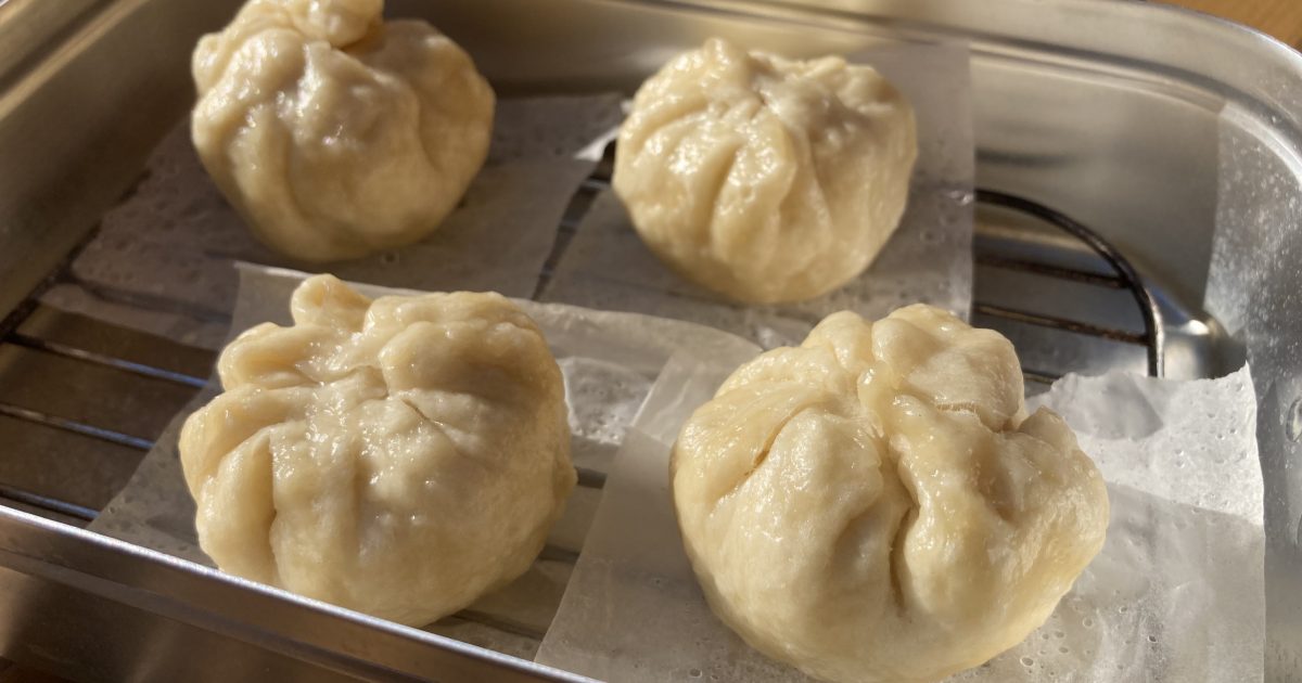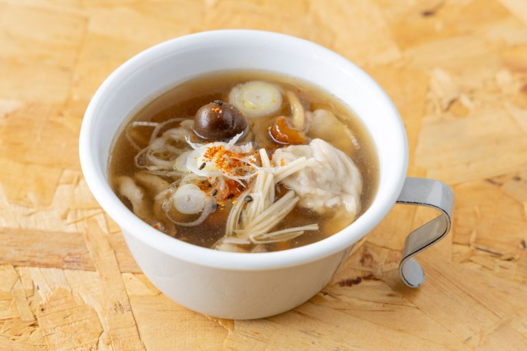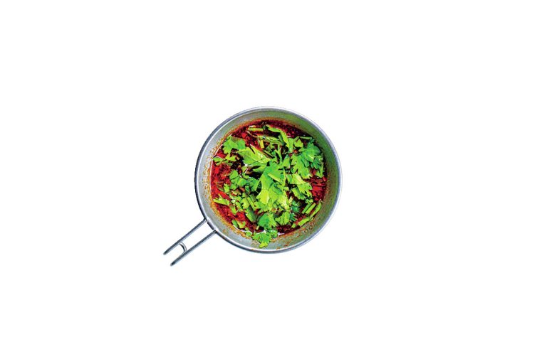 - 食べるラー油、酢、醤油を混ぜ、パクチーを加えたタレでいただく。