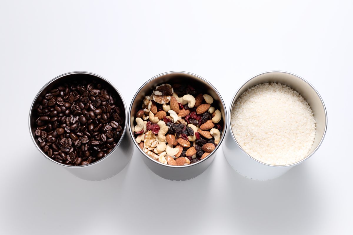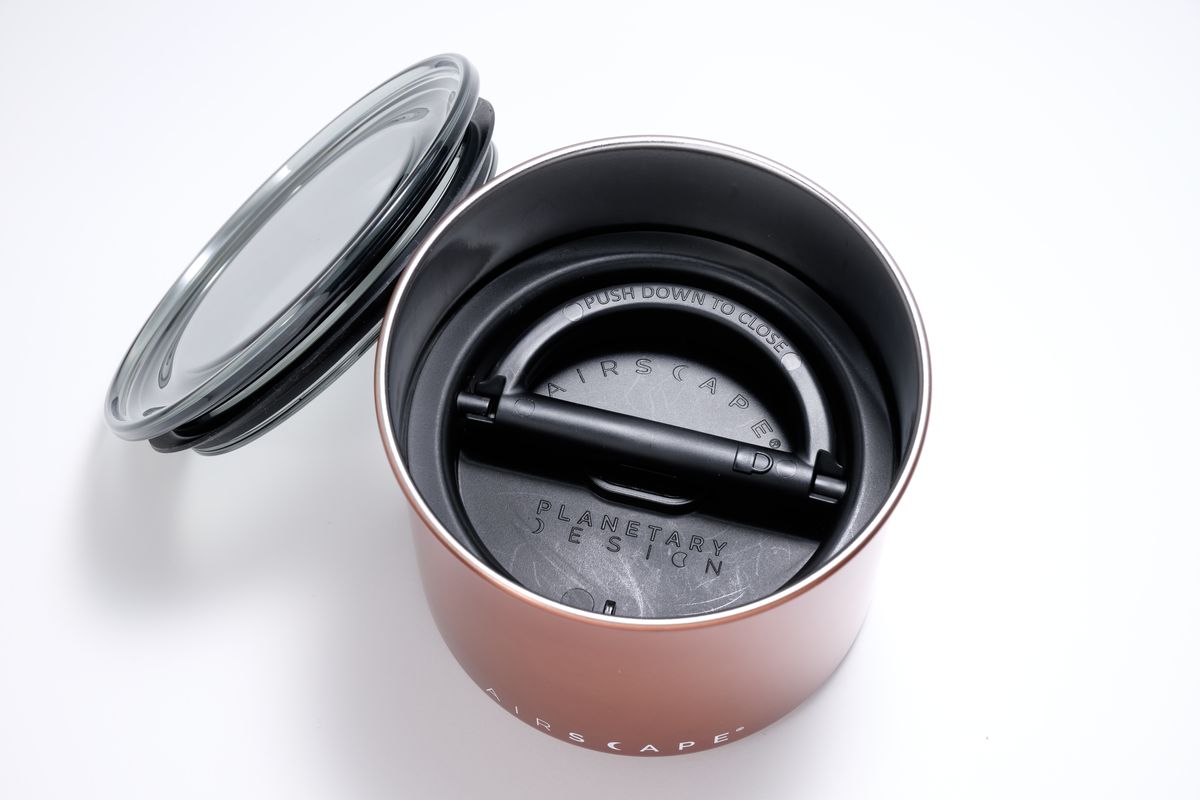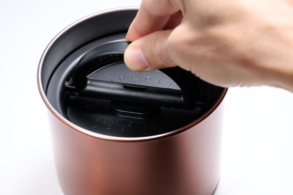 このキャニスターは蓋が二層。内蓋をグッと押し込むと空気が抜ける。ハンドルを倒すと空気穴が閉じられて空気が抜けた状態で密閉される。プラスチックではなくステンレスだから光も遮断される。中の食品は鮮度が保たれて、味が落ちにくいというわけだ。
