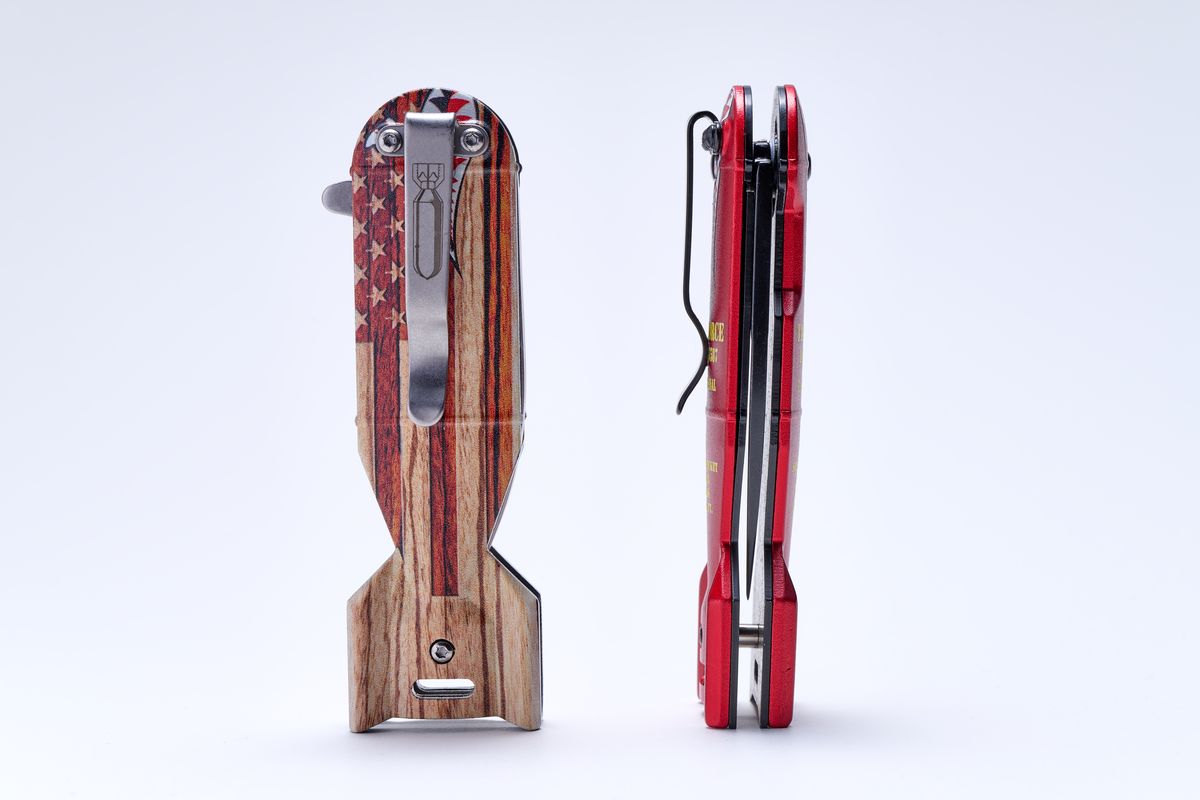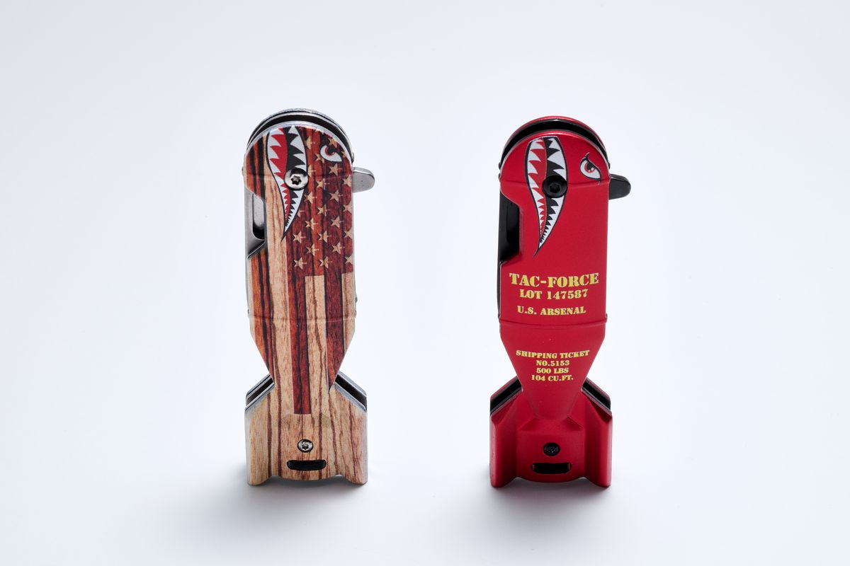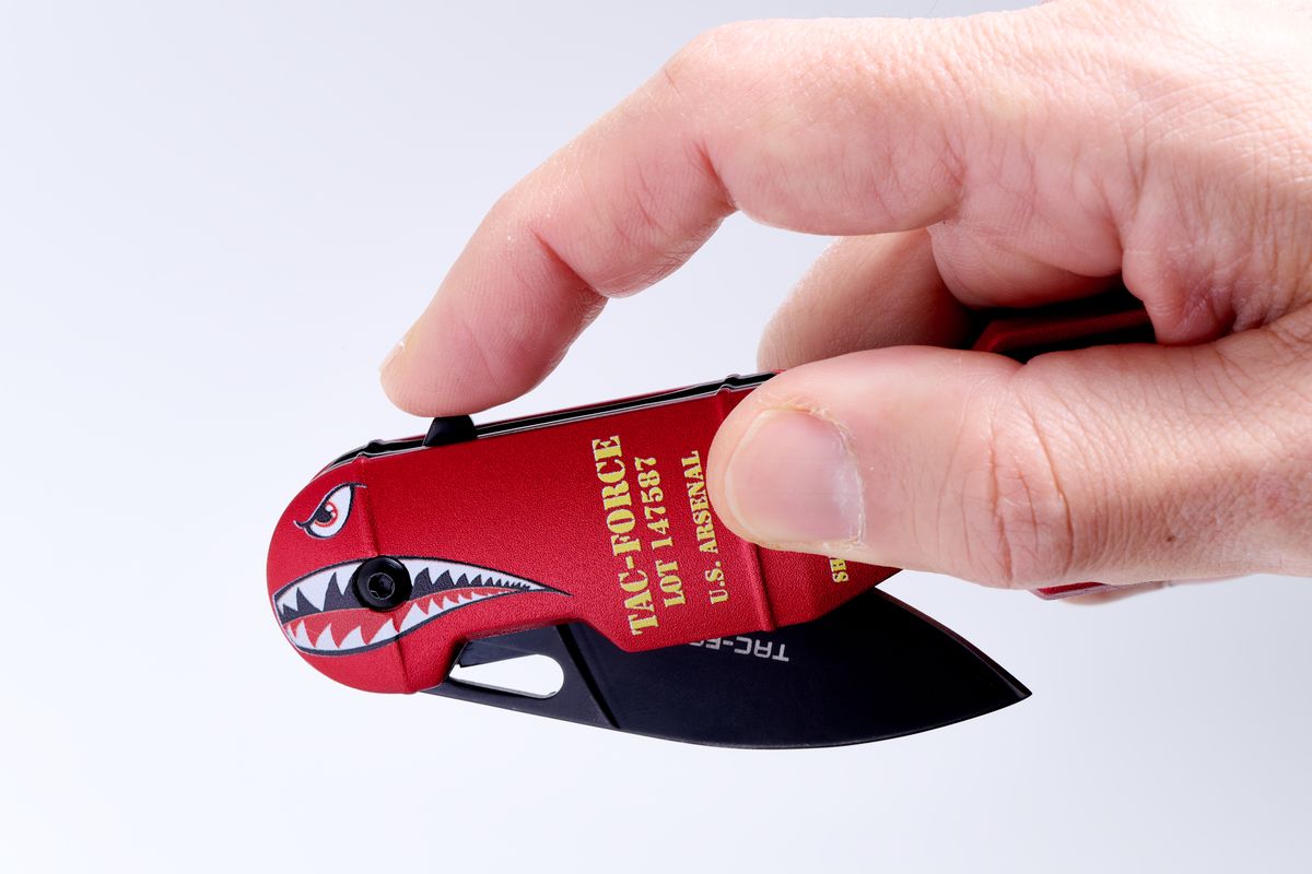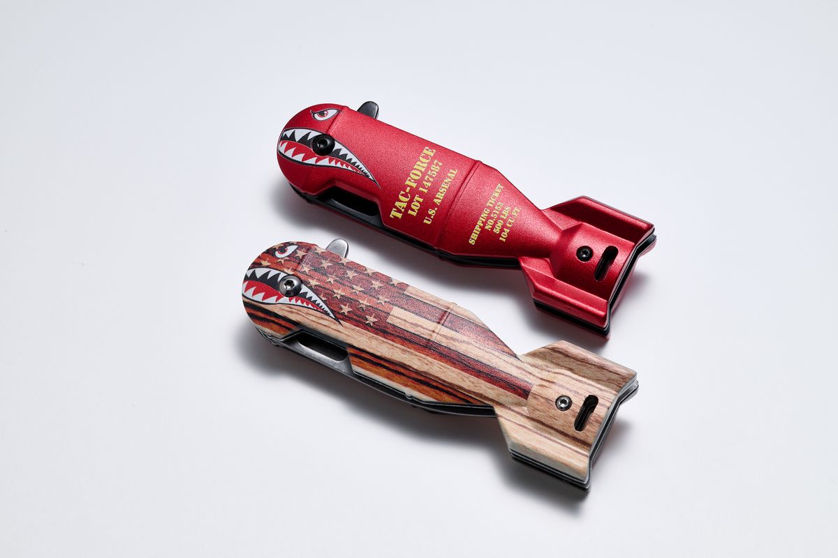 タックフォースは、アメリカのMaster Cutlery(マスターカトラリー)社のナイフブランド。「Shark Bomb Knife」は、刃長5cmほどのコンパクトなフォールディングナイフだ。ご覧のとおり、魚雷型のハンドルにサメの目と口が描かれている。なぜサメか……というと、ちゃんと由来がある。第二次大戦時の米軍兵士たちは自分たちの航空機のノーズ(機首)に、目印として、また戦意を鼓舞するものとしてイラストを描いた。これを「ノーズアート」という。ピンナップガールが描かれた機体を写真やマンガで見たことがあるかもしれない。シャークマウスも人気の絵柄のひとつだった。つまり、この商品はノーズアートを現代のナイフに蘇らせたというわけだ。