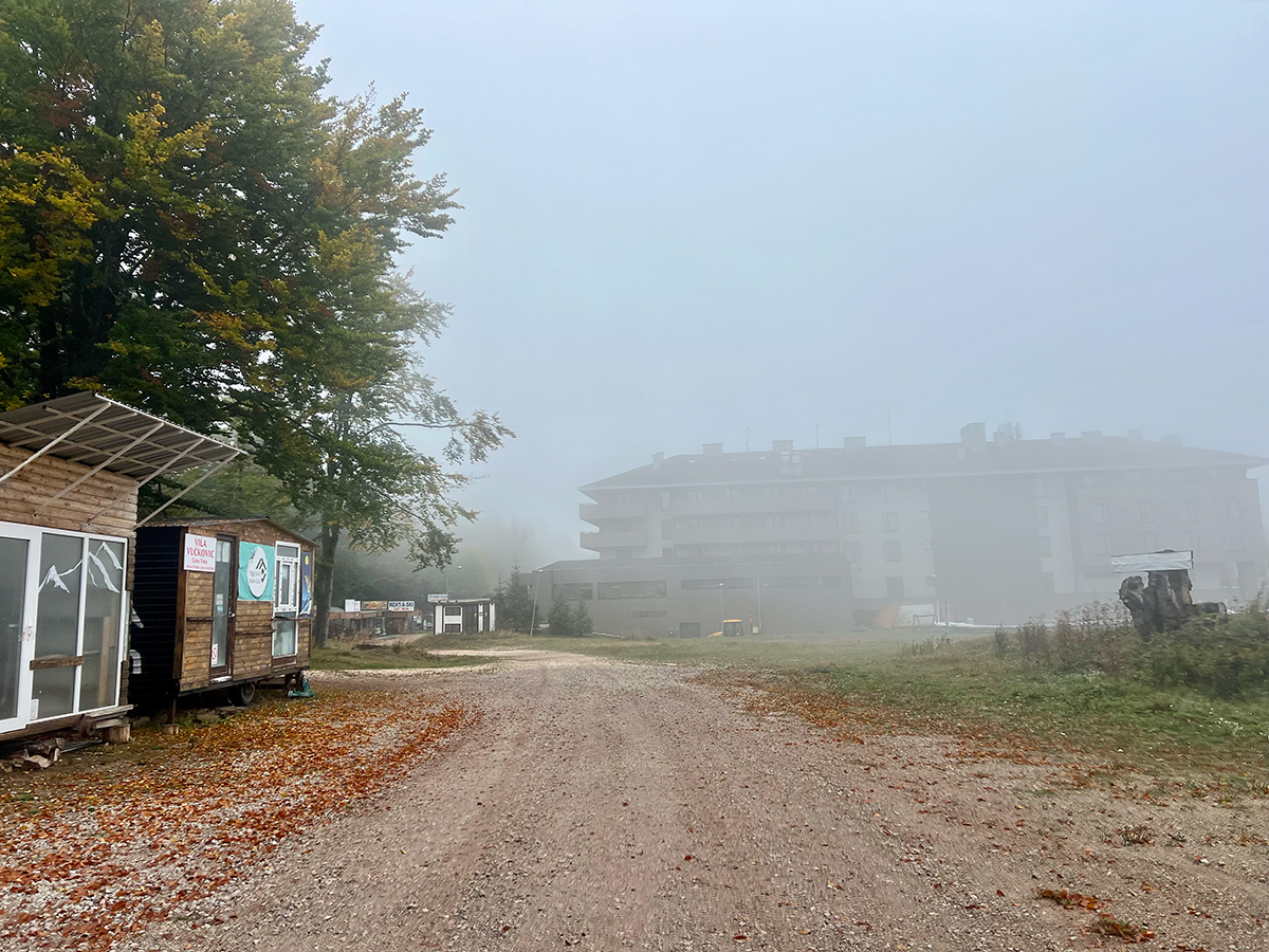登山のスタート地点は、Stara Planina ski resort(スターラ・プラニナ・スキーリゾート)。敷地内には広い駐車場があり、私たちはそこにキャンピングカーを停めました。冬季にはスキーやスノーボードで賑わうスキー場ですが、この時期は9月下旬のオフシーズンでゲレンデもリフトもすべて静まり返り、どこかゴーストタウンみたいな雰囲気が漂っていました。