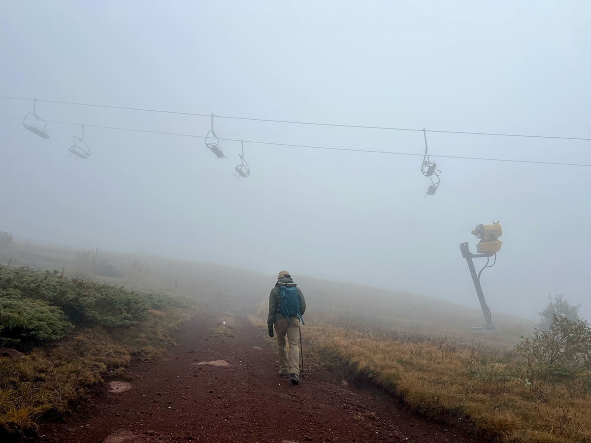 序盤は霧で周りが見えないが、どうやら広々としたスキー場のゲレンデコースを進みながらの登山道のようです。たくさんの分岐ルートがあるようで、霧のせいで迷いそうになるため要注意。スマホのGPSアプリで現在地と地図をこまめに確認しながら慎重に進んでいきます。