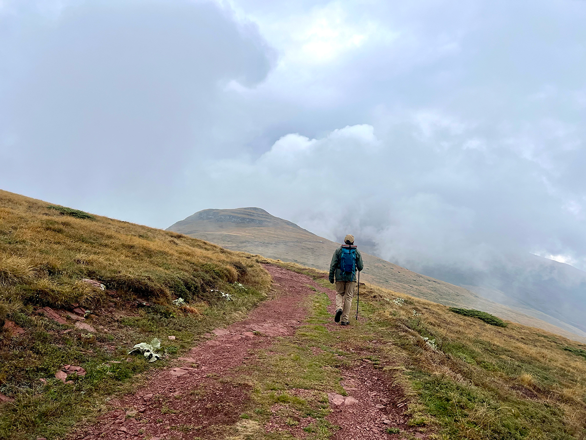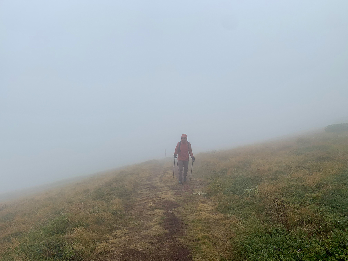 天気予報では晴天だったのですが、徐々に雲行きが怪しくなり、出発する頃には霧が濃く立ち込めていて、一歩先も見えないほど真っ白な世界に。山の天気は変わりやすいと言いますが、まさかこんなスタートになるとは…。それでも、気を取り直して霧の中を進んでいきます。