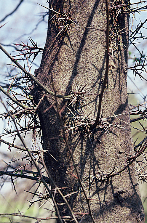バラをはじめ、ジャケツイバラ、ノイバラ、カラスザンショウ、それにタラノキやハリギリなどもトゲのある木だが、何といっても横綱はサイカチだ。