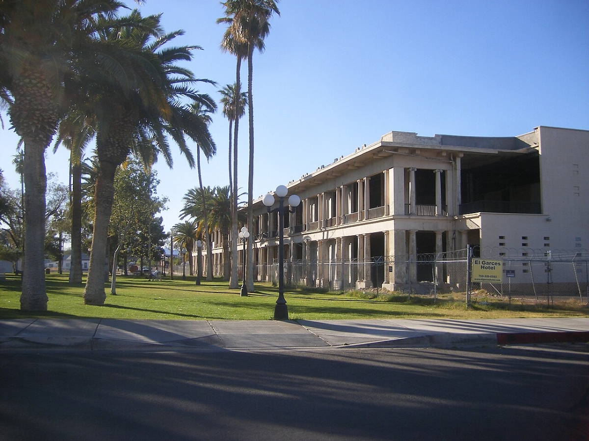 そして鉄道の時代がやってきます。1908年、サンタフェ鉄道によってEl Garces駅舎がニードルズに建設されました。単なる駅ではなく、ホテル、レストラン、待合室を備えた豪華な複合施設です。当時は「砂漠のオアシス」のような存在でした。淡い色の壁とアーチ型の回廊が特徴的なスペイン風の優雅な建物です。