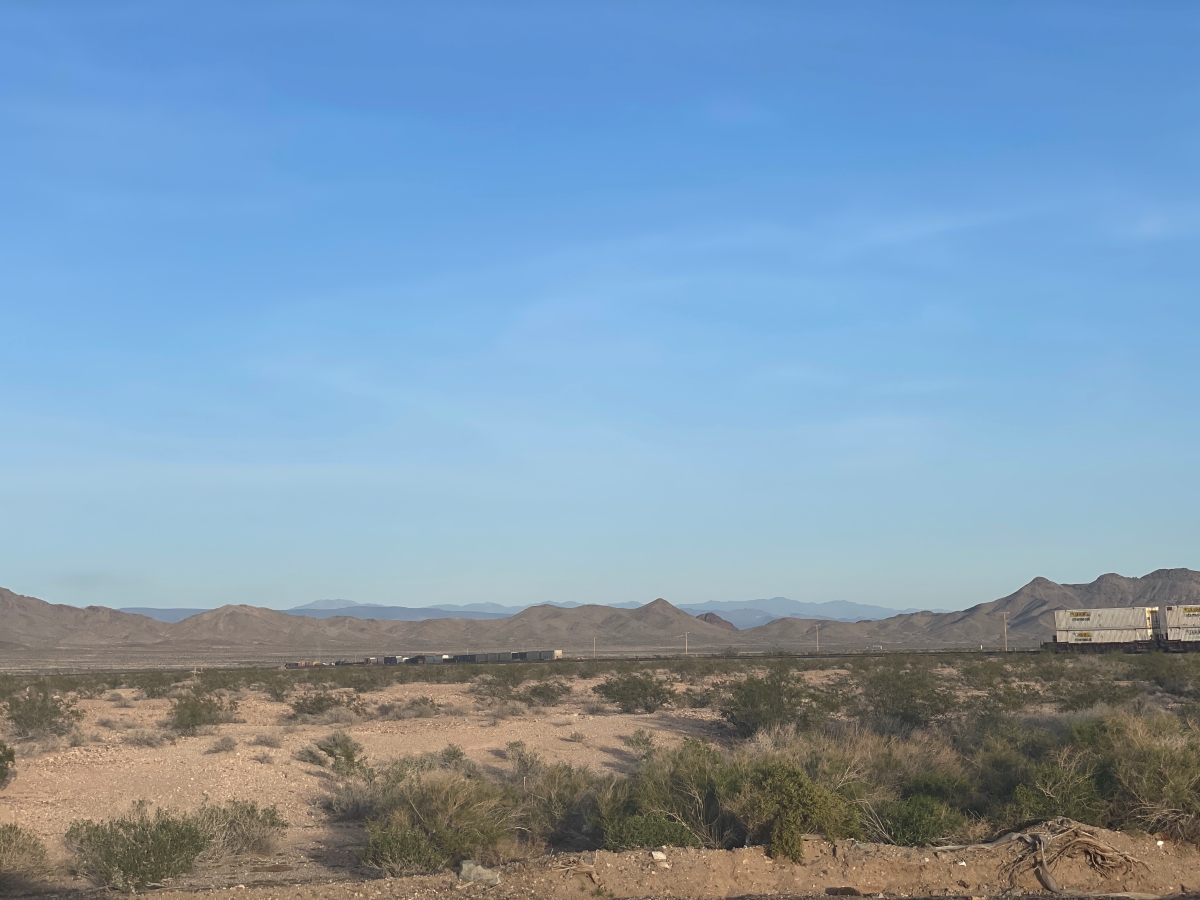 そのアリゾナ州を通り過ぎ、カリフォルニアとの州境が近づくにつれて、車窓から見える風景はだんだんと単調になっていきます。空と大地は相変わらず広大ですが、起伏が少なくなり、ぼそぼそと生えている灌木も緑より茶色が目立つようになります。要するに砂漠です。