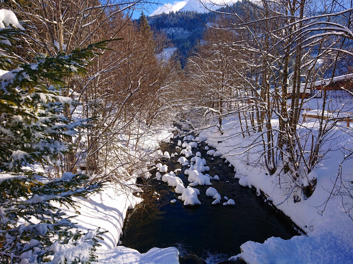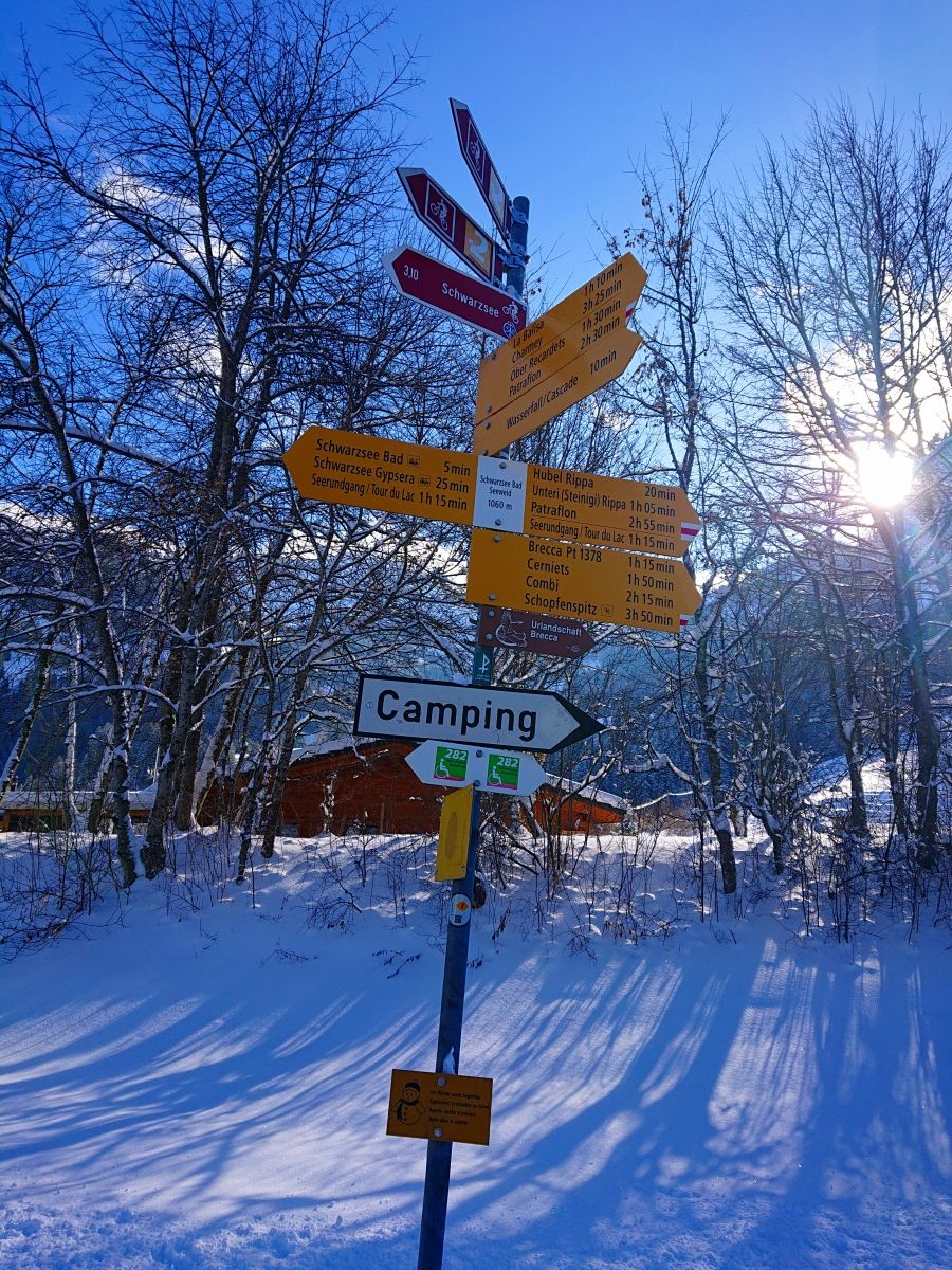 キャンプ場近くの駐車場から散策開始。すぐ近くにある小川の橋を渡って行きました。シュヴァルツゼーを訪れた日は日中気温が氷点下2℃ほどでしたが、青空が広がり風もなかったのでウォーキングには最適です。