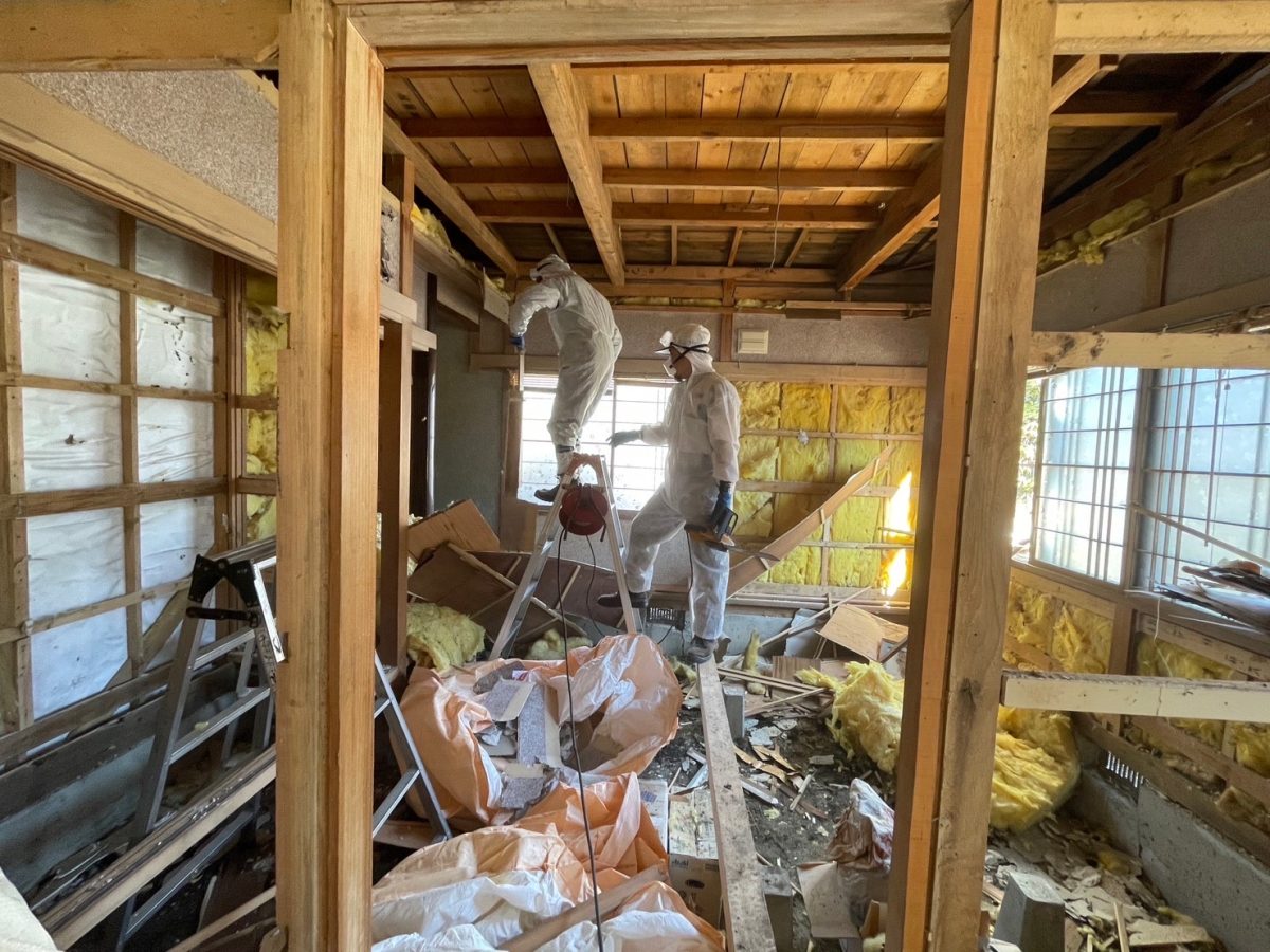 天井や内壁の解体には苦労した。内側には断熱材のグラスウールが入っている。薄板を剥がすと、大量のホコリとともに、劣化したグラスウールが頭上から降り注ぐ。細かい繊維が空中をキラキラと漂う。一見、美しくてファンタジーな光景なのだが、吸い込んではならない。グラスウールが襟や袖から入り込むと、チクチクして猛烈にかゆい。だから不織布でできたフード付きのつなぎを着込み、マスクとゴーグルを着用する。手袋をつけた上からビニールテープをグルグル巻きにして、万全を期す。当然ながら猛烈に暑い。汗でゴーグルがすぐ曇ってしまい、手元がよく見えない。一日の終わりには意識が朦朧としてくる。