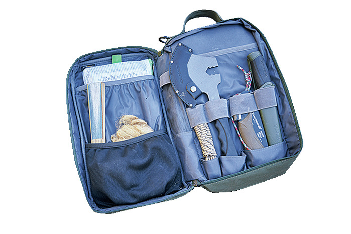 斧やナイフ、火吹き棒など焚き火に使う道具一式が納まる。「団扇より扇子がたためて便利です」