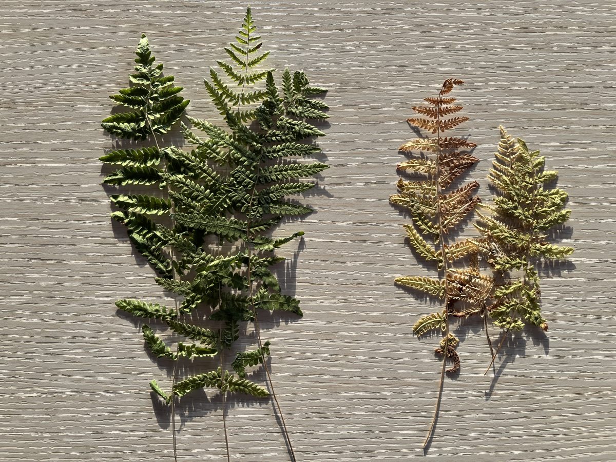 乾燥時の処理で異なる葉の色(右側は直射日光が当たったもの)