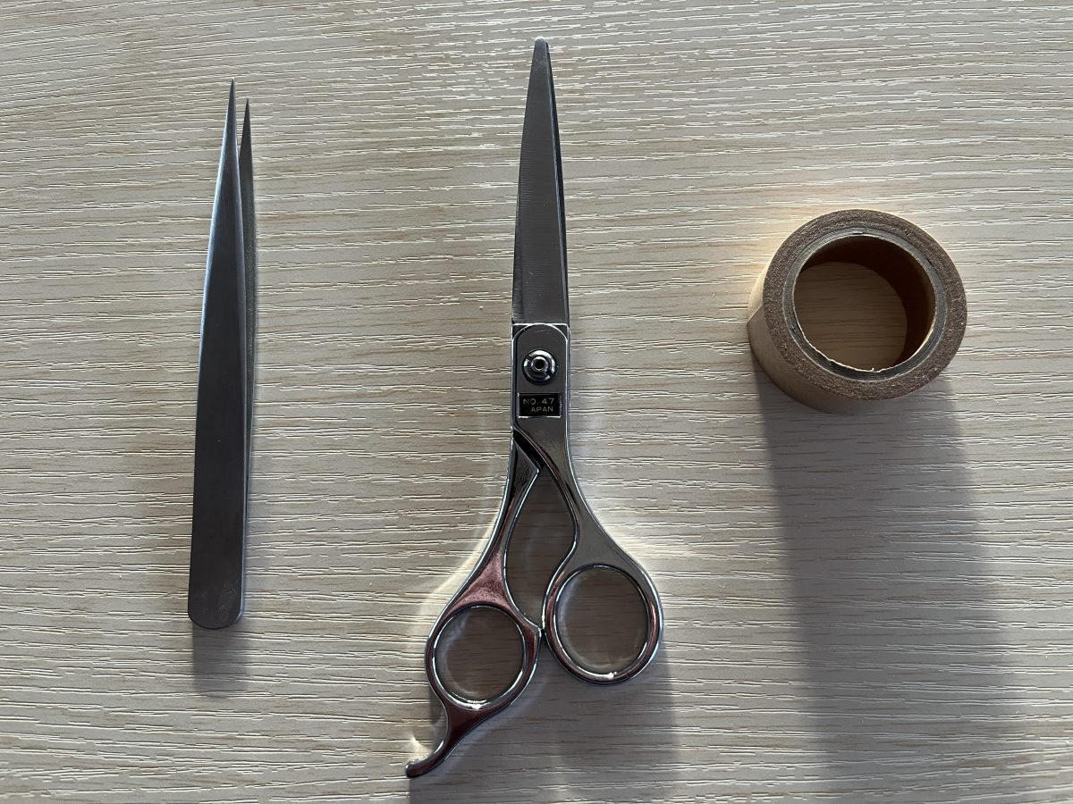 左からピンセット、はさみ、マスキングテープ