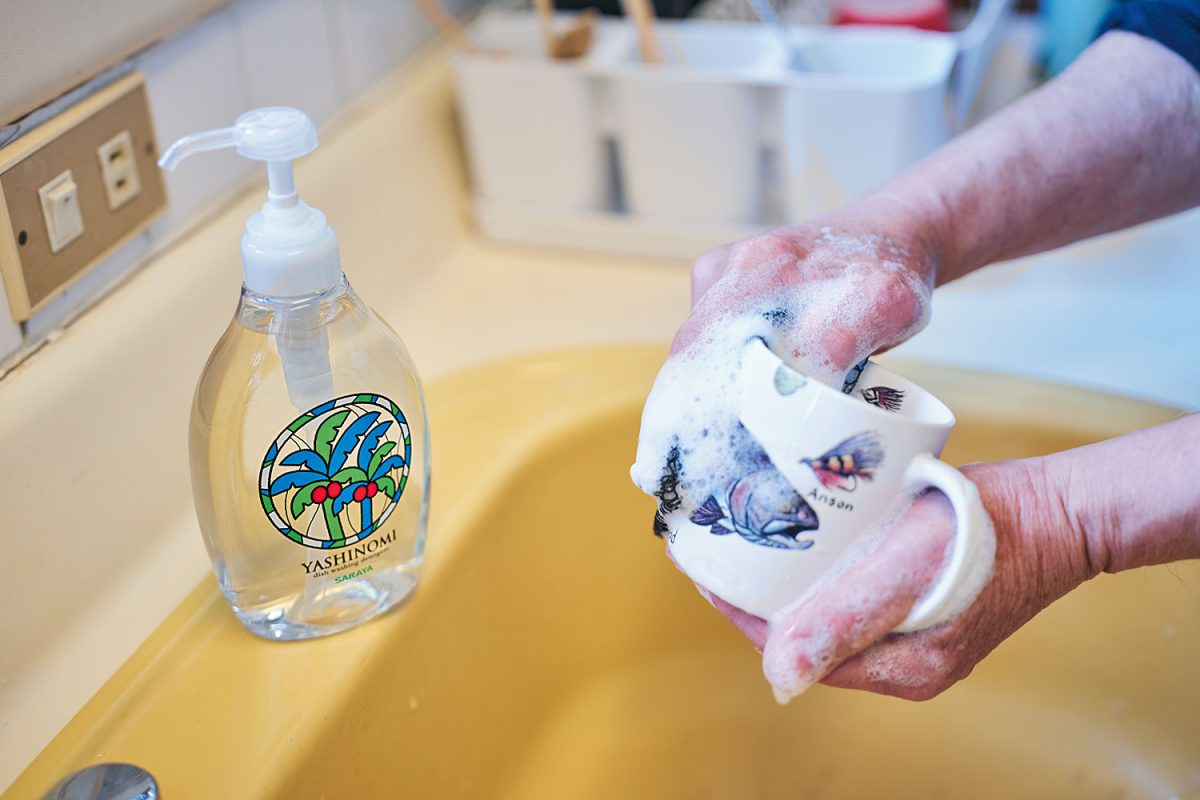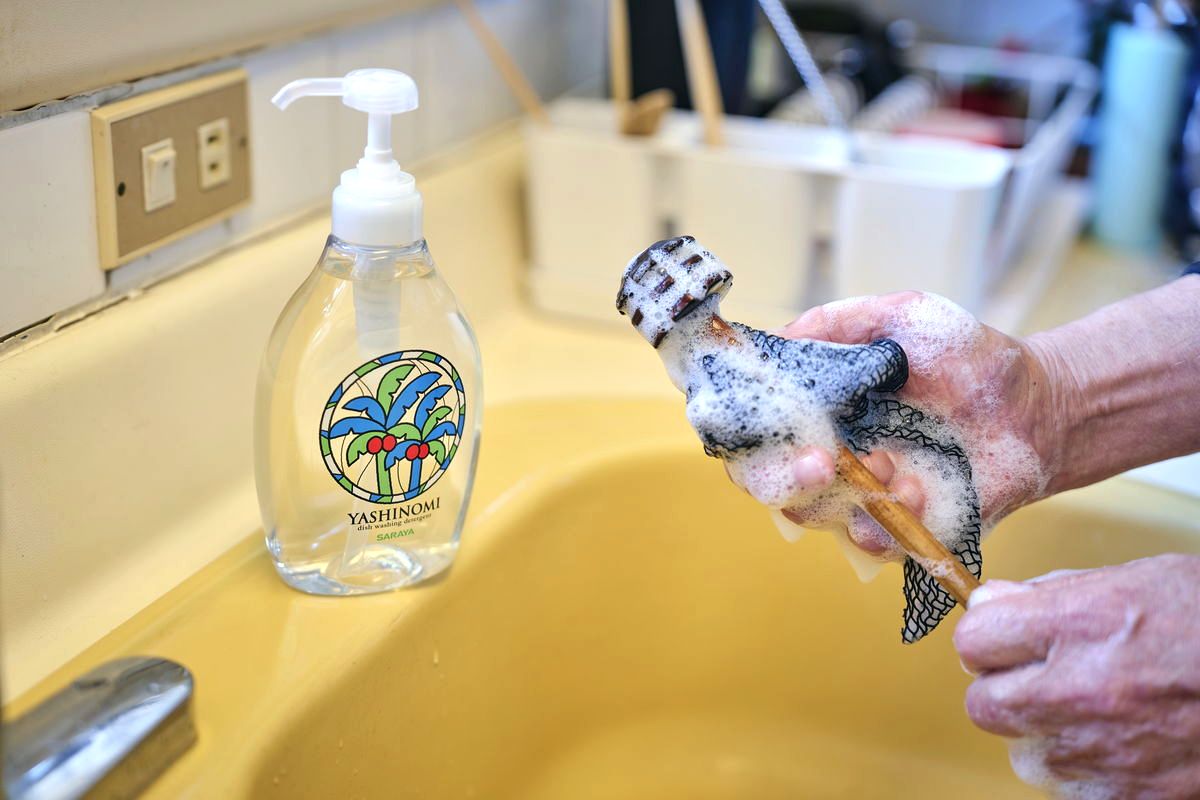 「ヤシノミ洗剤は愛用していますよ。ヤシの実由来の洗浄成分を使っているから、排水は微生物が素早く分解してくれます。スポンジは漁網をアップサイクルしたタワシ。少しの洗剤量でほど良く泡立って、細かいところまで汚れが落とせるから、ヤシノミ洗剤とは相性抜群なんですよ」