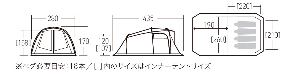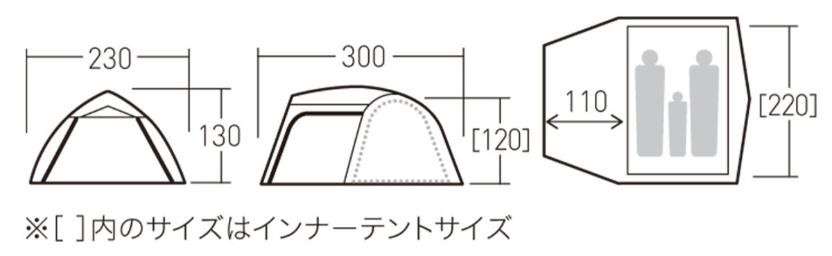 素材:フライ;T/C(耐水圧350mm)、インナーテント;T/C+ポリエステル68d、グランドシート(インナーテントボトム部分);ポリエステル210d(耐水圧1,800mm)、ポール;6061アルミ合金(φ16mm、7.9mm)