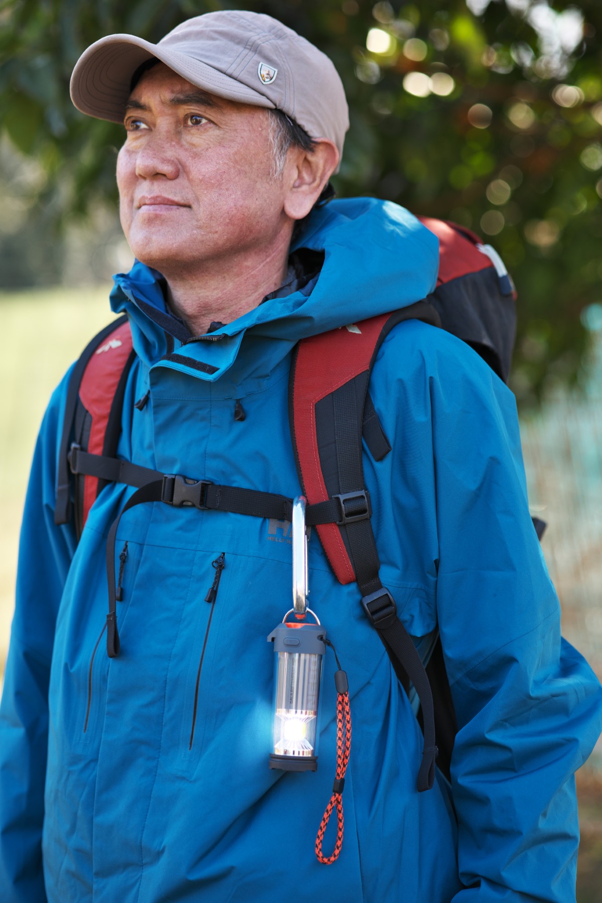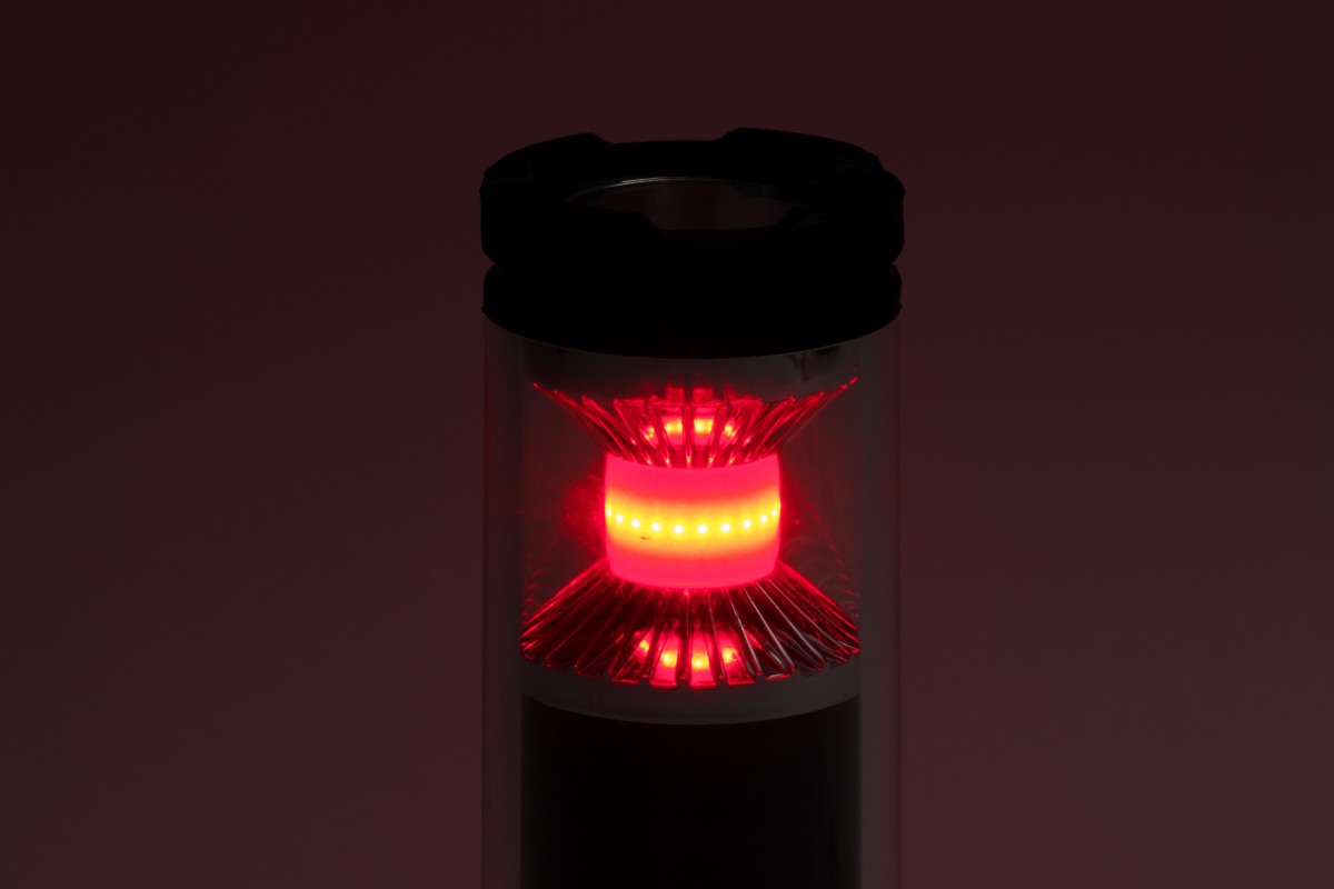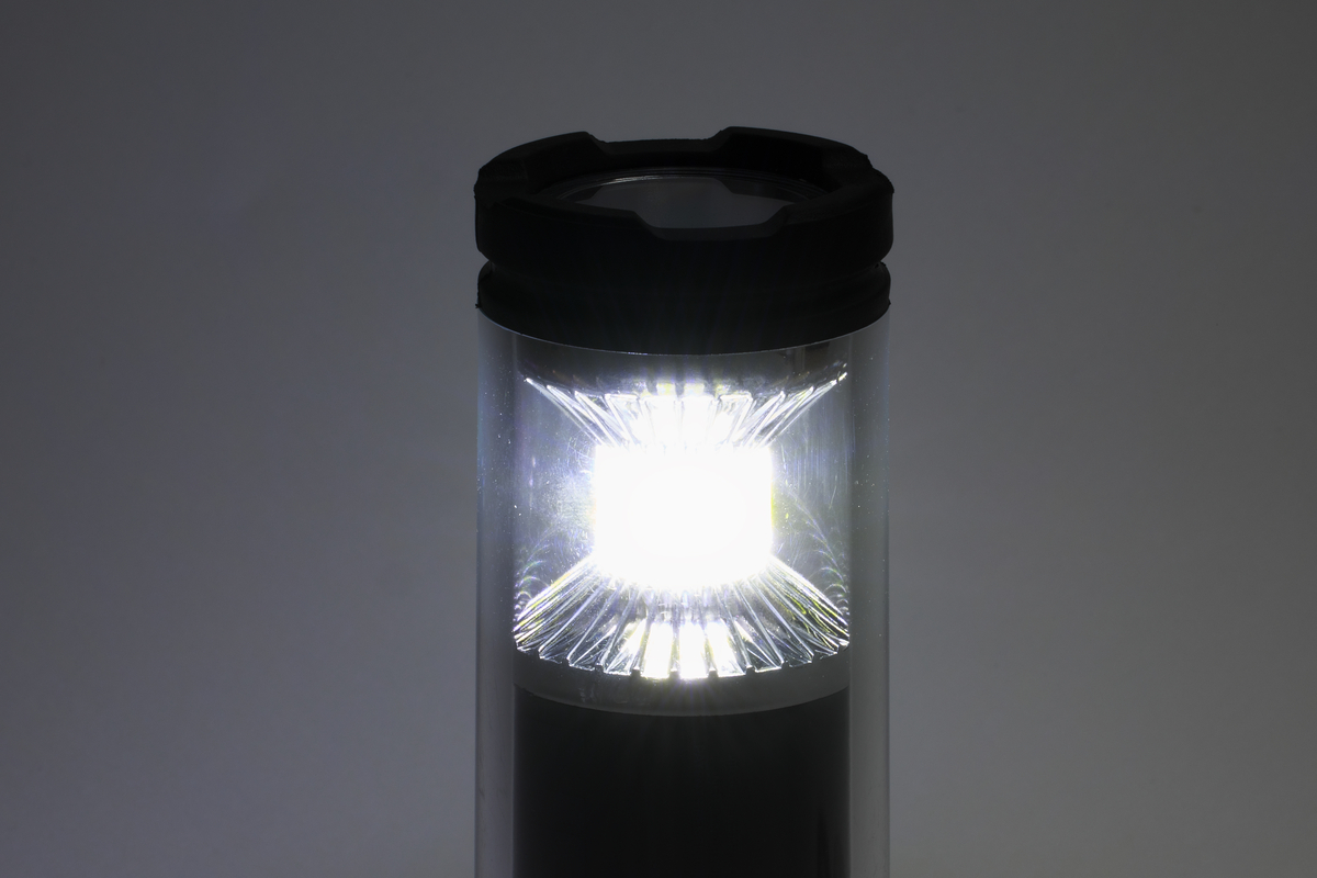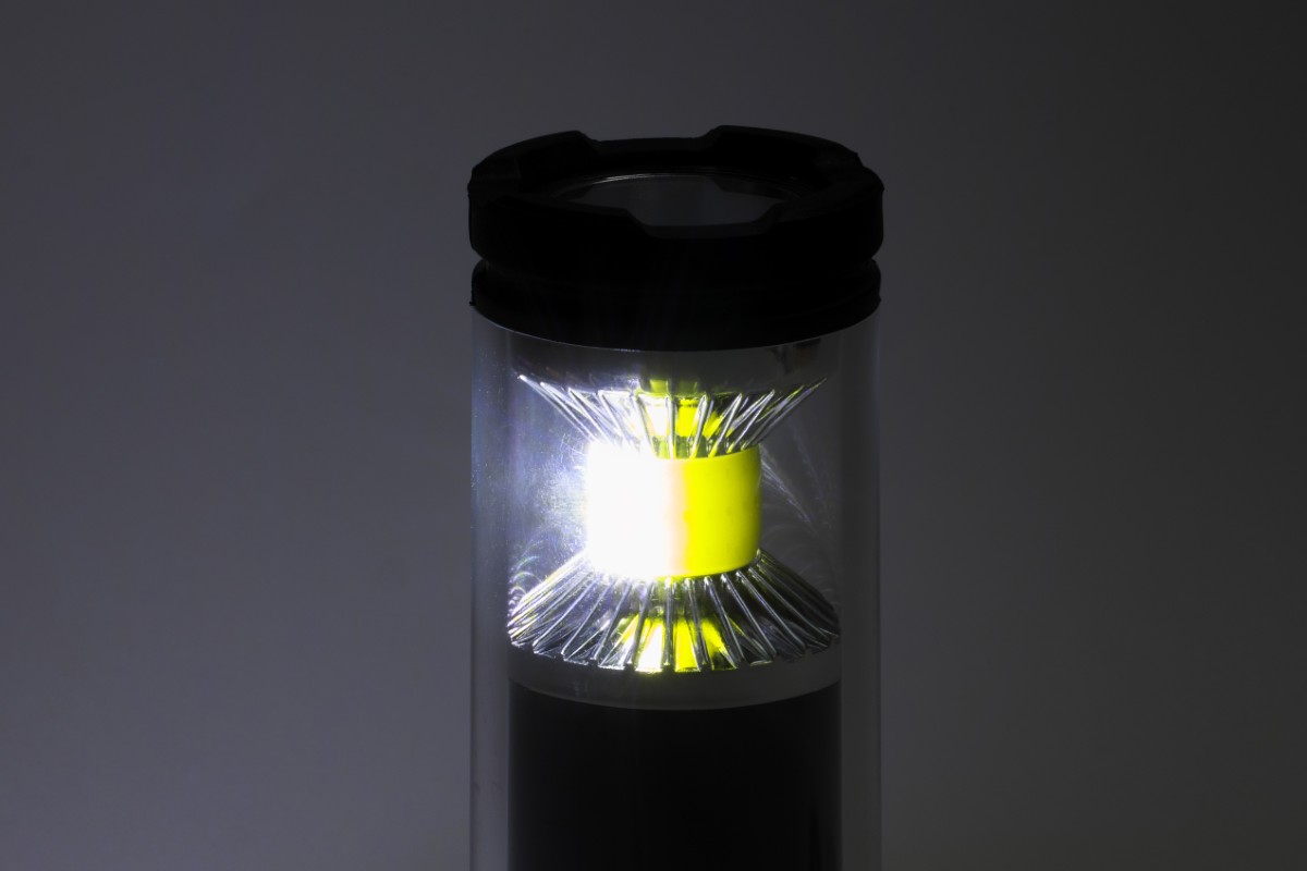 ランタンの黄色い部分がCOBのLED。一般的なLEDと違って、ひとつの基盤にたくさんのLEDを配置して面で発光させるから、光が広くまんべんなく拡散して明るく感じられる。光量を絞っても明るく感じられるから省電力にもつながる。一方、上部のスポットライトのほうは、通常のLEDを使用し、光の角度も狭くして、遠くを照らすことに特化している。112m先まで光が届くというから、夜道を歩くときに心強い。