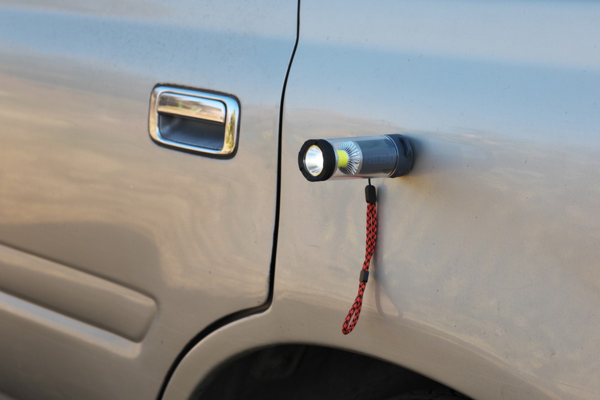 もうひとつの特徴であるランヤード(ストラップ)を見ていこう。ループの途中にストッパーが付いていて、これを締めることで上部のくぼみに固定することができる。こうするとスポットライトとして使うときに手に提げることができる。また、このループを底部のフックに引っかけると、逆さにしてランタンとして吊るすことができる。ささいなことだけど、カラビナなしで吊るせるからとても便利だ。