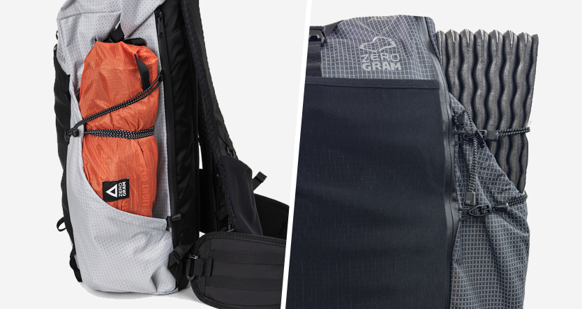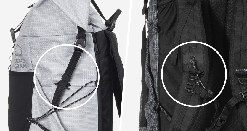 特に両サイドポケットは深さがあり、30Lではフォールディングチェア、50Lではソロテントやスリーピングパッドが収まるサイズ感。それでいて、背負ったままウォーターボトルの出し入れができる使いやすさも確保している。