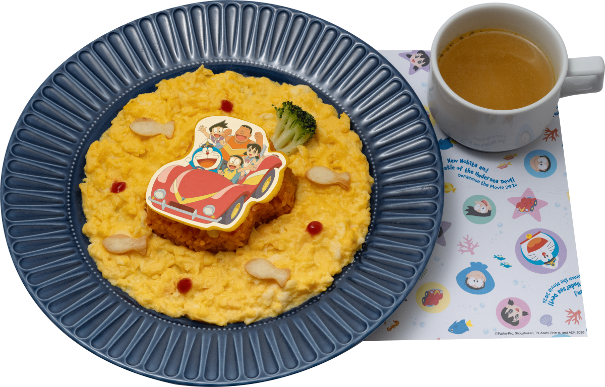 映画に登場するひみつ道具「水中バギー」がライスになったふわとろ卵のオムライス。ふわふわの卵と、ケチャップの甘みは相性バツグン。大人も子どもも大好きな味だ。