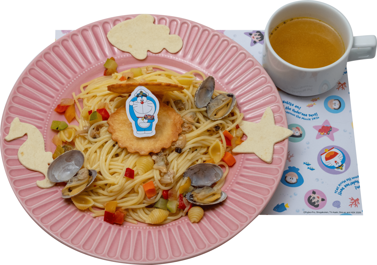 魚介のうまみが存分に頼めるボンゴレビアンコは、海底をテーマにしたグルメにピッタリ。ドラえもんがかぶっているのは作品に登場するひみつ道具「カメレオンぼうし」。ハマグリと昆布茶で深みを醸し、アサリの旨味が凝縮したソースをからめた麺がポイントだ。