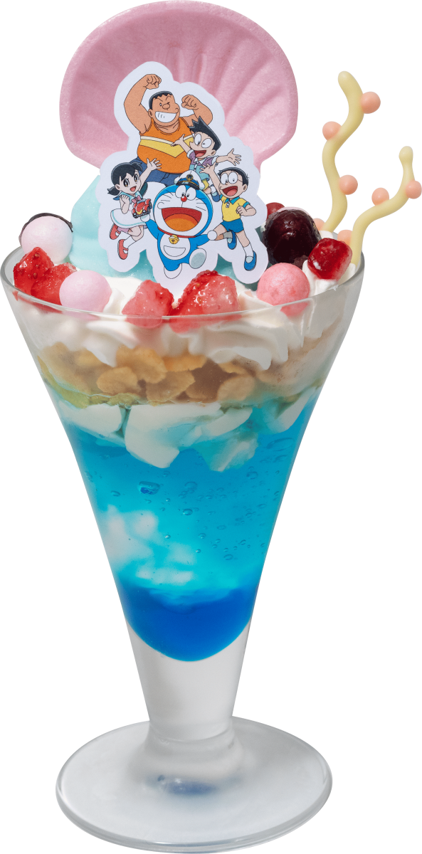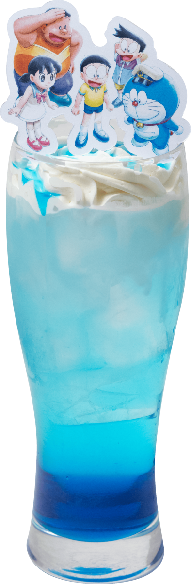 作品の登場する海面に立つドラえもんたちの印象的なシーンを再現。グラスの中で海底が広がる様子が表現されている。
