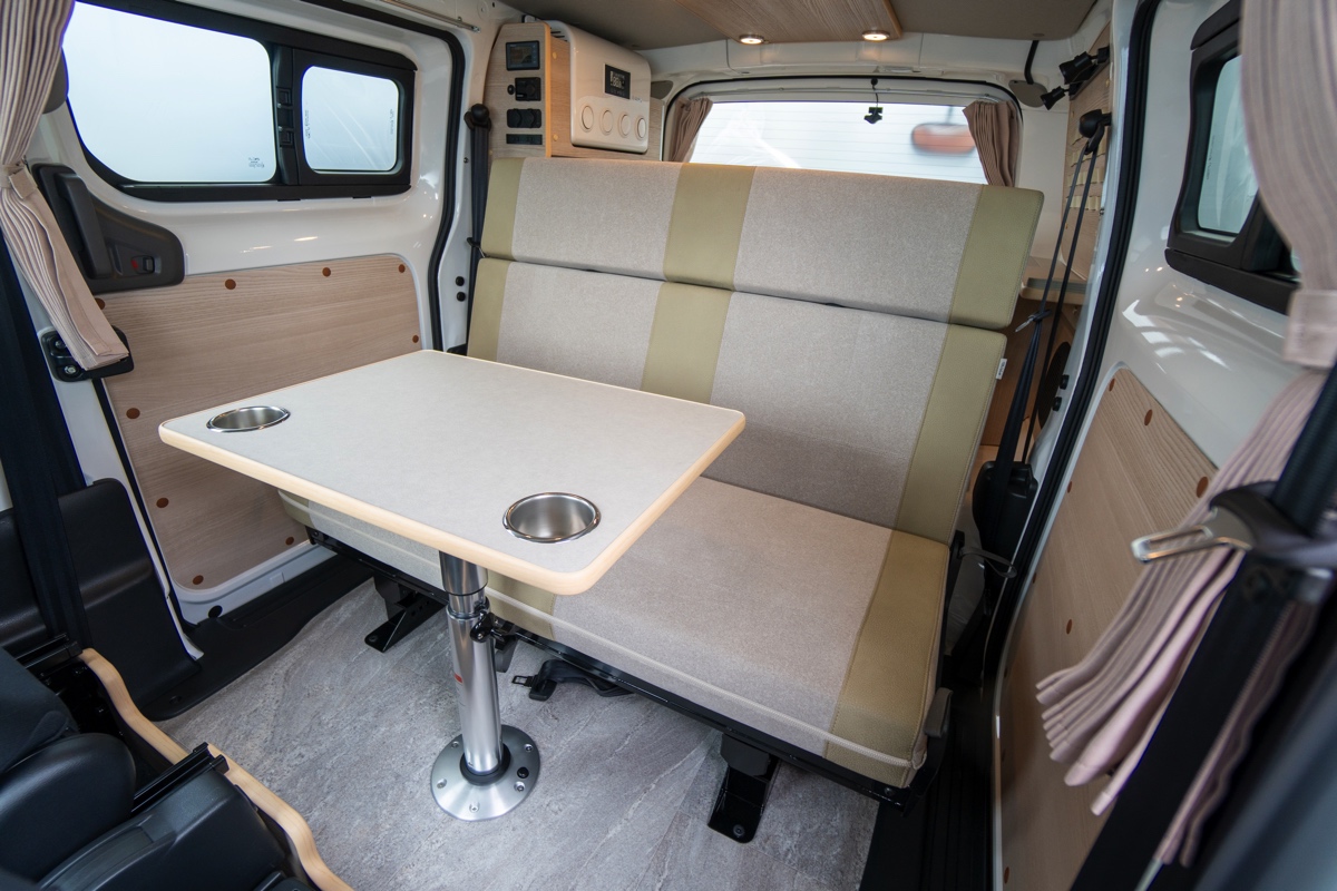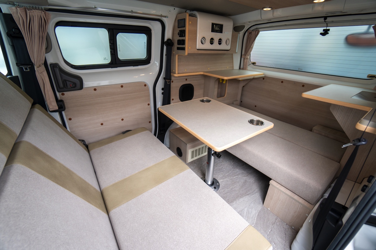 リビングはセカンドシートを前向きのままテーブルがセットできるため、2人で並んで食事などもできるほか、セカンドシートを反転させ荷室のベッドマットとの対面リビングにすることも可能になっています。