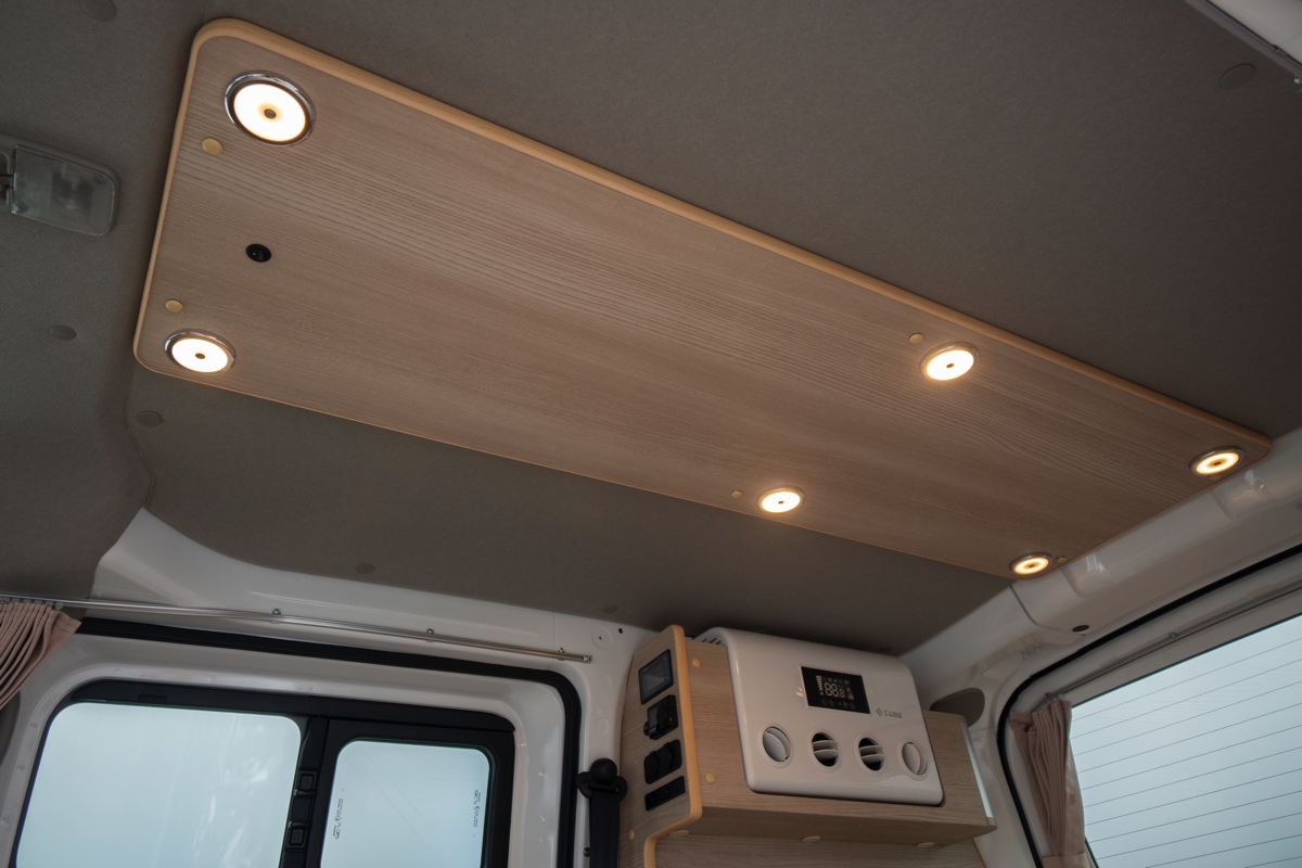 インテリアのほうはナチュラルウッドテイストの家具類に加え、キャンピングカー用のセカンドシートやベッド生地にはベージュカラーを採用し、明るく落ち着いた空間を実現。天井には飾り板付き照明も備わっています。
