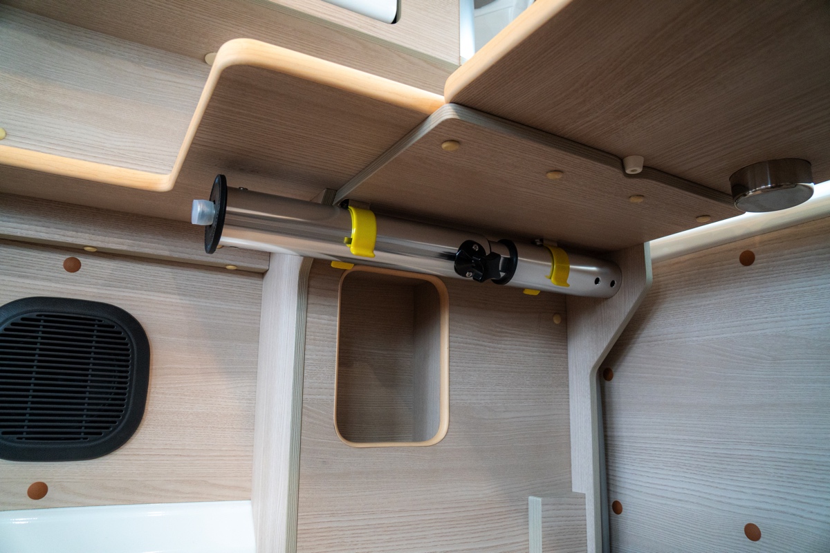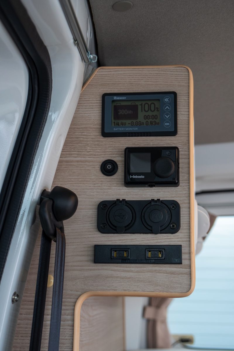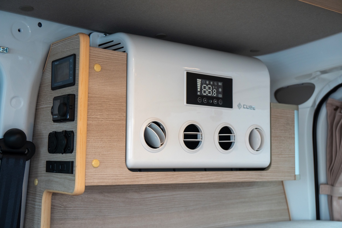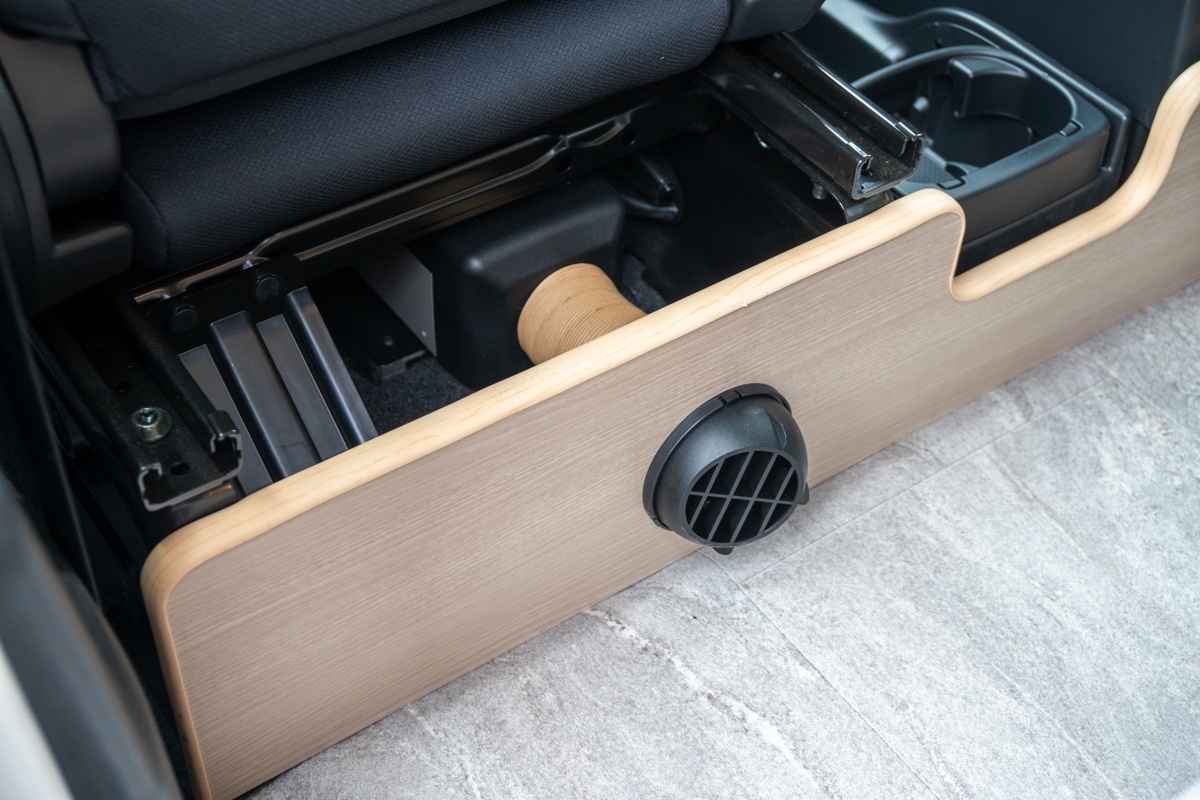 また、右キャビネットにはオプションのDC12Vクーラーを家具内に装着することも可能で、「12Vクーラーパック」では300AhサブバッテリーにFFヒーター、ルーフベントまたは200Wソーラーパネル、クーラー専用電源ソケットが一式セットされ、より快適な旅が行えるようになっています。
