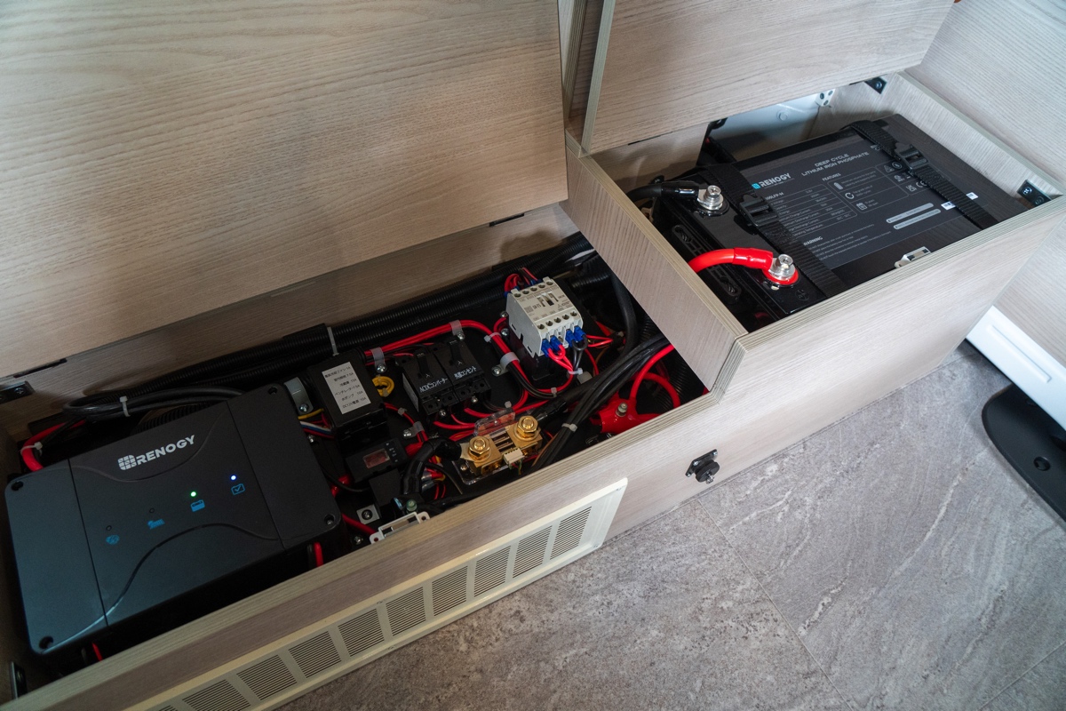 右キャビネット下部に電装システムを格納。取材車は「12Vクーラーパック」モデルのため、300Ahリチウムイオンサブバッテリーを搭載