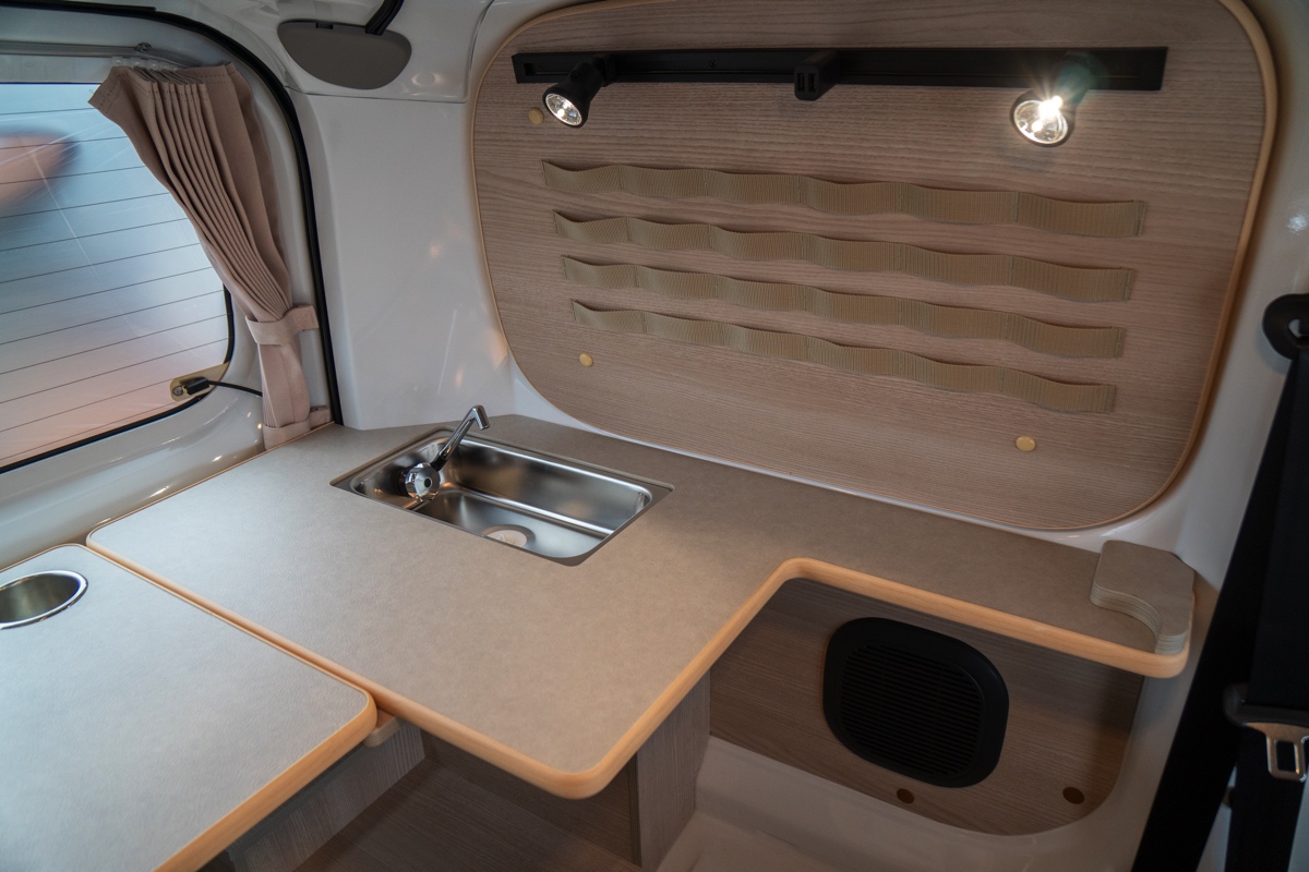 装備面では荷室左側にシンク&蛇口に加えリアクオーターウインドウ部分にサイドモールシステム付きの窓埋めボードを搭載。右キャビネット側は100Ahリチウムイオンサブバッテリーなどの電装システムや集中スイッチ、ACやUSBポートを集約した機能的な作り。