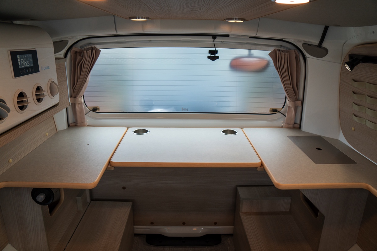 またテーブルは最後部のキャビネット間に橋渡すことができるようになっており、移動中は荷物棚になるほか、キャンプ場などではバックドアを開けて調理台などとしても活用できる、使いやすさが光る設計。