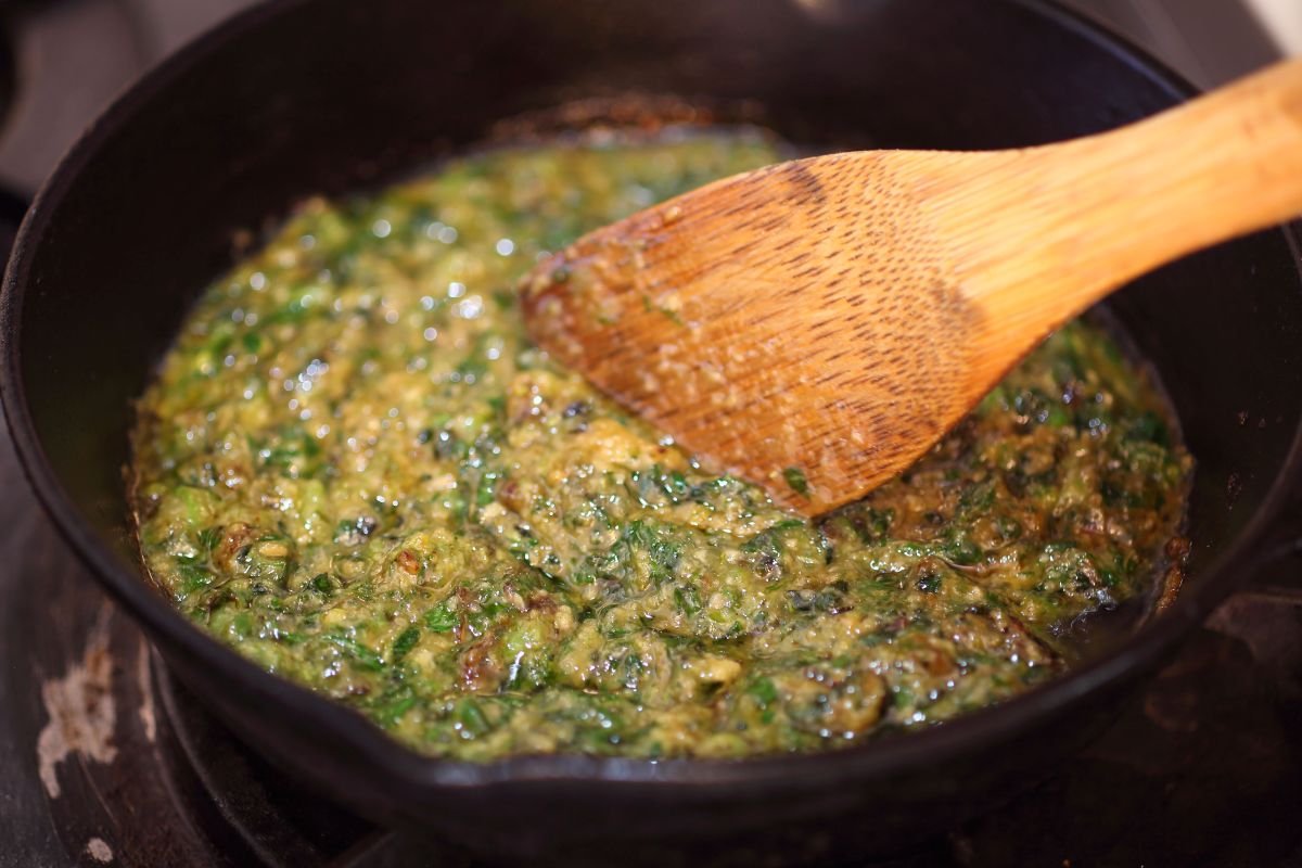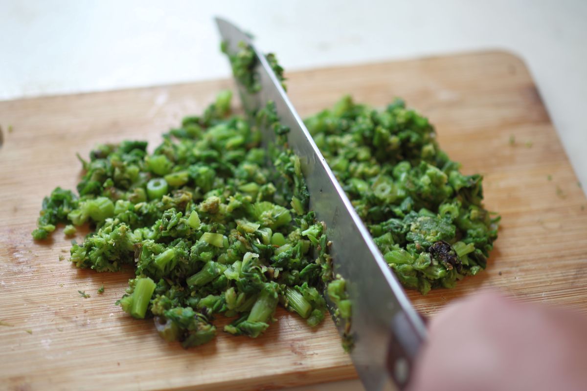 味噌だれができたらふきのとうをさっと茹でてぎゅっと絞り、細かく刻む。エグ味が苦手な人は少し長めに茹でてもいい。続けてフライパンに油を多めに敷き、刻んだふきのとうと味噌だれを入れて水気が飛ぶまで弱火で練る。フキのフレッシュな香気がほしければさっと混ぜる程度でいいし、まろやかにしたければ長く加熱するか油を多めにするといい。使う油はサラダ油や太白胡麻油のようなプレーンなものだとフキの香りが生きるが、オリーブ油や胡麻油でつくってもそれはそれで美味しい。まったく油を使わず、茹で時間も短くしてつくったっていい。エグ味も強いがフキの香りも強くなる。ふきのとう味噌は、自由なのだ。