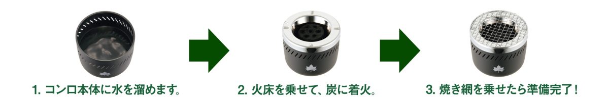 使い方は本体に水を入れ、火床をセットして炭に着火し、焼き網を載せるだけ。工程が少なく、初めてでも扱いやすい。