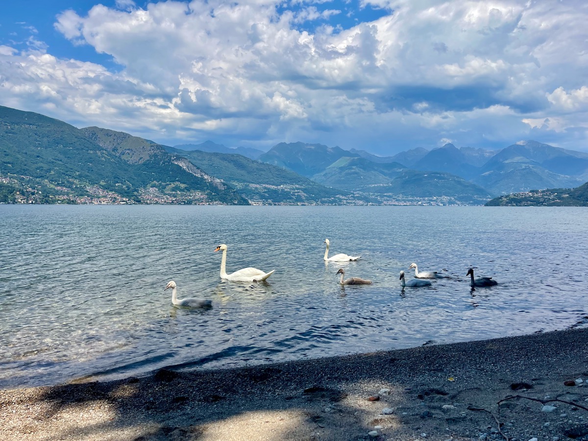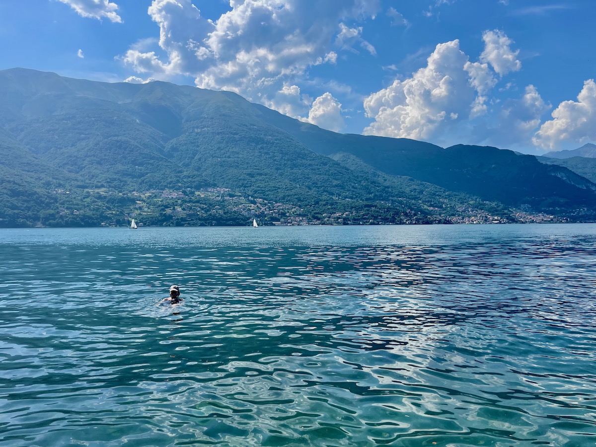 実は、出かける前に「深い氷河湖のコモ湖は、水が冷たくて泳ぐのは危ないし、楽しくない」と聞いていたのですが、夕方の軽いお散歩で湖畔までたどり着くと、地元っ子がたくさん水に飛び込んでいました。まだまだ強い太陽光の元、透明度の高い水はとても魅力的です。