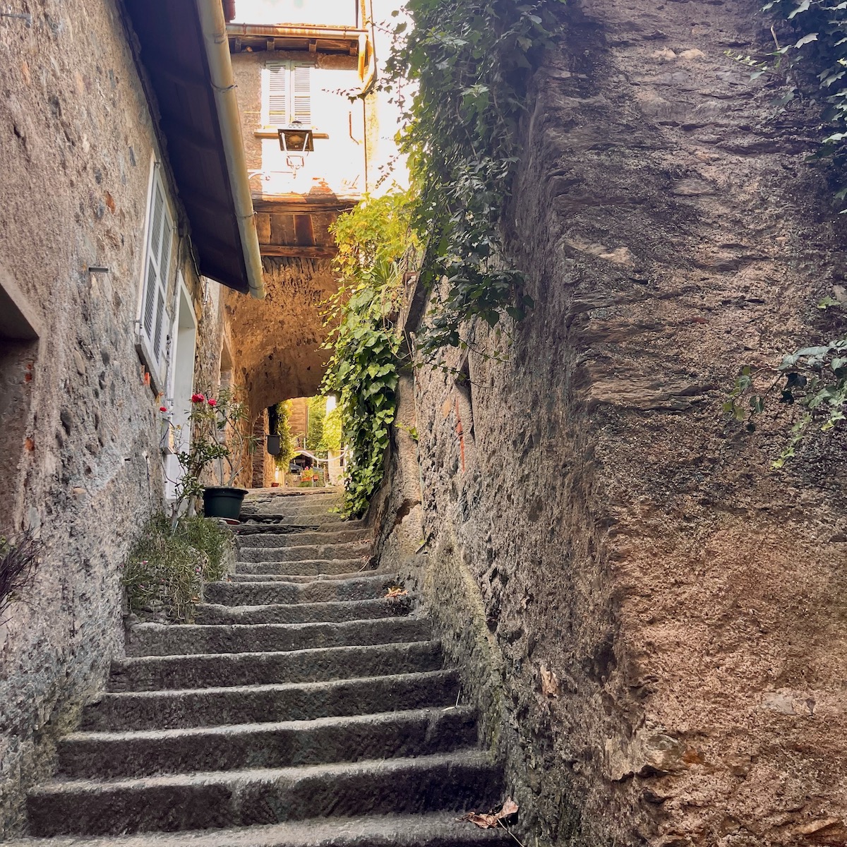湖を見下ろす岩の岬の上に築かれたコレンノ・プリーノは「千の階段の村」とも呼ばれるのですが、訪れると「なるほどねえ」と、そのニックネームに納得がいきます。というのも村中に城から湖までの岩を削って作られた階段段が何本も巡らされているのです。また、その階段の間は、狭い小道で繋がれています。