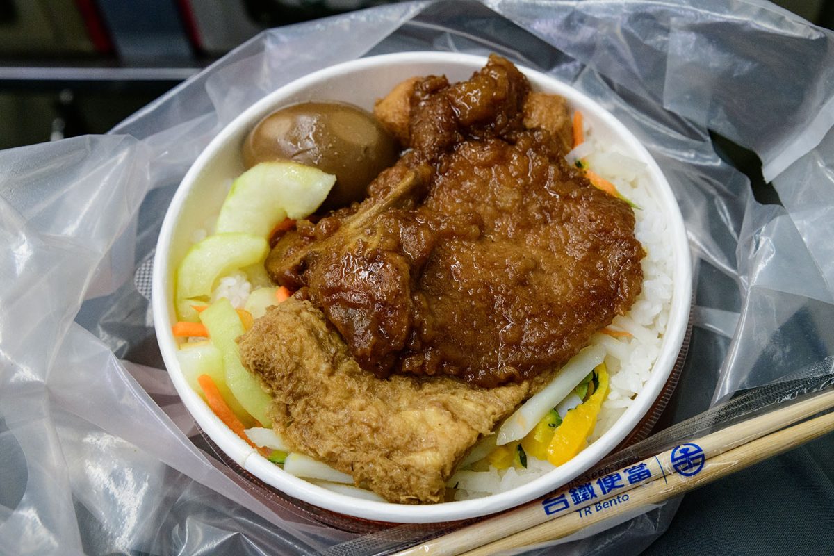 今回選んだのは、台鉄弁当では一番オーソドックスな、骨付き豚肉を揚げた排骨(パイクー)の駅弁。豚肉や煮卵、厚揚げ、漬物など、どれも白飯と一緒にかっ込むのに合ってますね。ちなみに台湾では、こうした駅弁はたいてい、ほんのり温めた状態で売ってくれるので、乗車直前に買うと幸せになれます。
