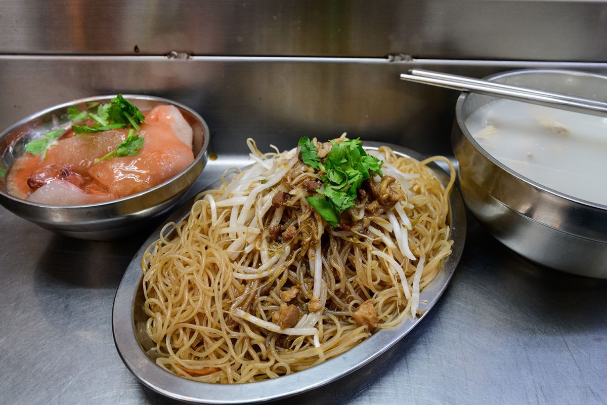 新竹都城隍廟にある食堂の一つに入り、新竹の名物料理と言われている、米粉(ミーフェン、ビーフン)をいただくことにしました。一緒に頼んだのは、肉圓(バーワン、肉などをでんぷんの皮で包んだもの)、四神湯(スーセンタン、漢方と豚モツのスープ)。米粉は炒めたもののほか、汁麺仕立てで食べるものもあります。さすが本場の米粉だからか、弾力が強くて、ボリュームと食べ応えがありました。