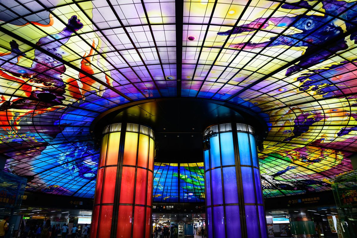 高雄の街の中心部にある、美麗島(メイリーダオ、フォルモサ・ブールバード)駅。2本の地下鉄が交差する乗り継ぎ駅で、広い構内には飲食店などもたくさんあります。2008年に完成したこの駅は、直径30メートルもの鮮やかなステンドグラス作品があることで有名です。イタリアの芸術家、ナルシサス・クアグリアータ氏が4年の歳月をかけてドイツで制作した作品を、はるばる高雄まで輸送してきたのだとか。今では高雄を象徴する映えスポットの一つとなっています。