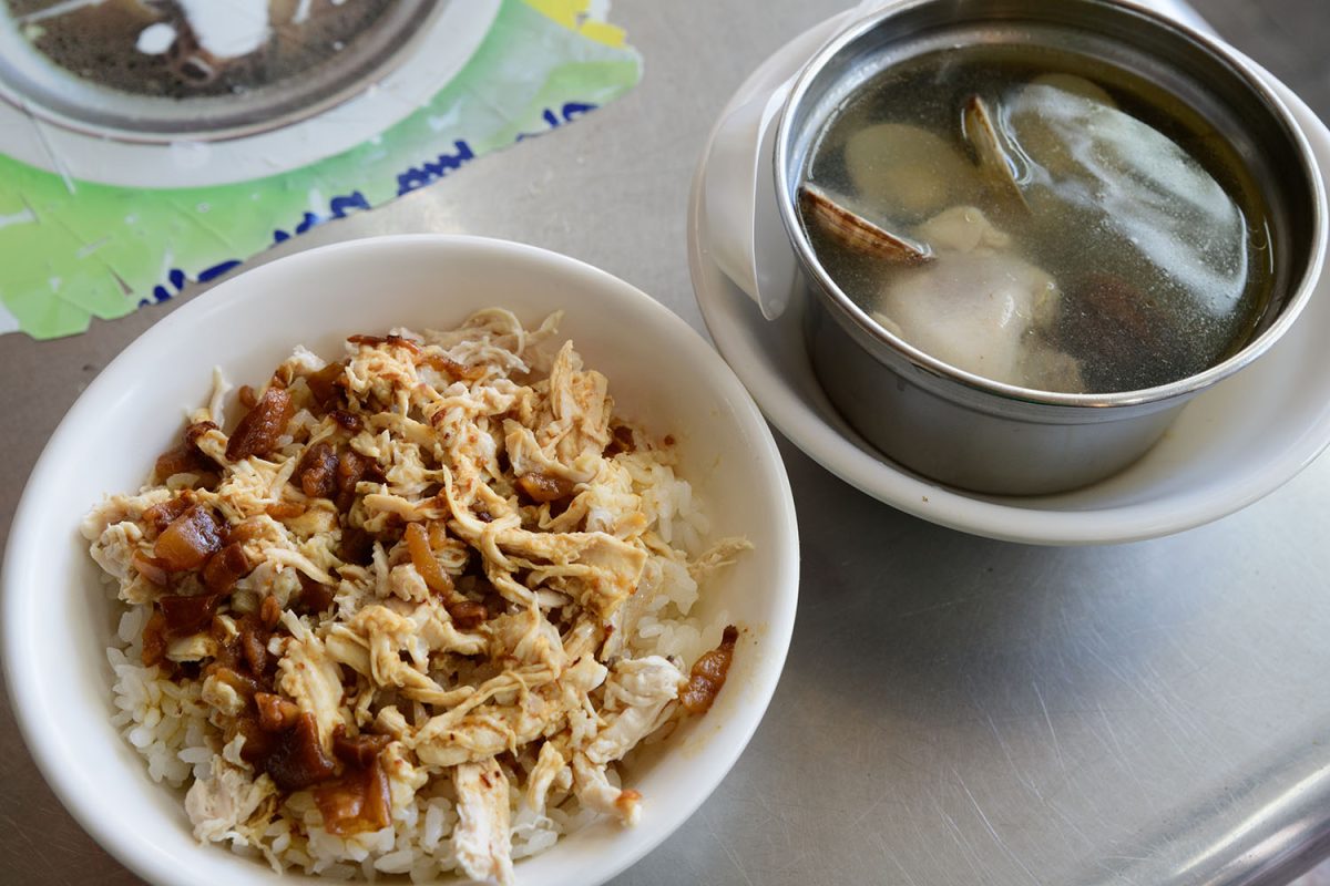お目当ての食堂のひとつ、大圓環雞肉飯(ダーユエンフエンジーロウファン)でおひるごはん。ほぼオープンエアのこの食堂はいつも大入満員で、ほとんどの人が、雞肉飯(ジーロウファン)と蛤仔鶏湯(ハマージータン)の組み合わせを注文しています。ふっくら柔らかい鶏肉には少し滷肉(ルーロウ、甘辛く煮た豚肉)が載っていて、混ぜて食べるとちょうどいい感じ。そして、蛤仔鶏湯の澄み切ったスープには、手羽元とハマグリのうまみがたっぷり沁み出ていて、まさに絶品。前回の旅でもいただいて、あまりのおいしさにびっくりしたのですが、また食べられてよかったです。