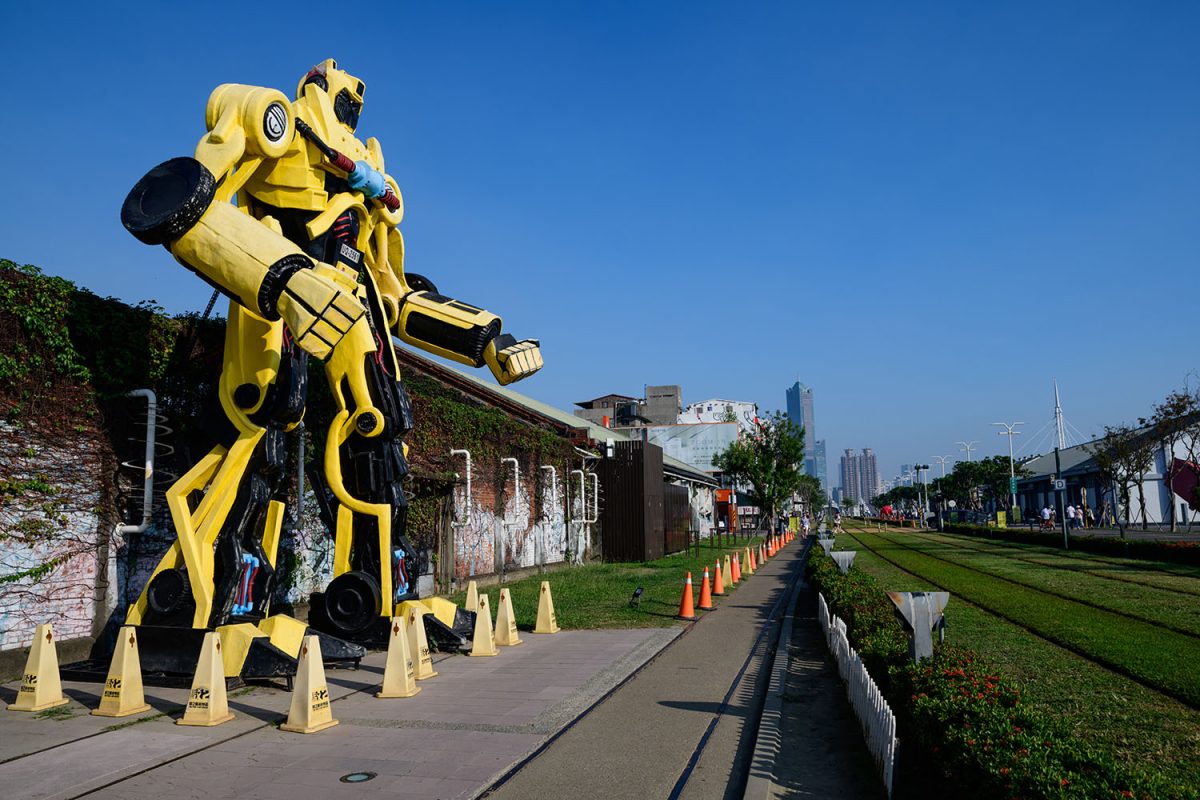 新楽街から南の方に歩いていくと、高雄港のある海沿いに出ます。港の近くには、鉄道の敷地や倉庫の跡地を再利用する形で設けられた、駁二藝術特區(ボーアルイーシュートゥーチュー)と呼ばれる区画があります。倉庫の建物はリノベーションされ、ギャラリーやショップ、カフェなどとして活用。外壁をダイナミックにペイントした倉庫や、写真のような巨大でカラフルなオブジェがいくつも置かれていて、高雄の現代アートスポットとして人気を集めています。