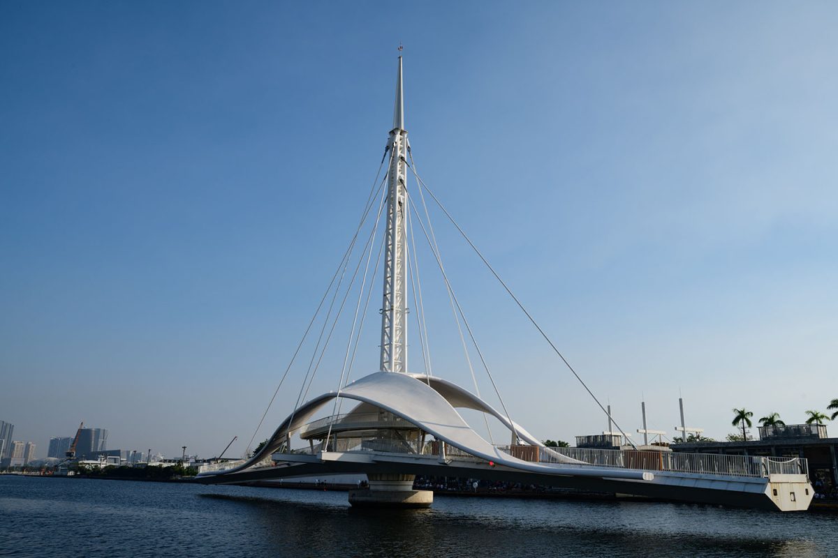 駁二藝術特區と対岸との間には、2020年夏にできた新しい橋、高雄港大港橋(カオシュンガンダーガンチアオ)があります。完成した形でこの橋を見るのは、僕も初めてです。台湾で初めて造られた水平旋回橋だそうで、毎日15時には、実際に旋回する様子を見物できます。白い水鳥を思わせる優雅な佇まいで、こういう存在が、実際に街のインフラとしても機能しているのはすごいことだな、と感心しました。