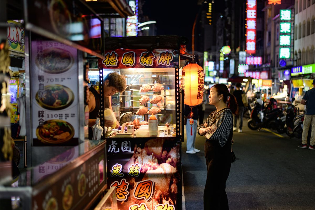 高雄港の付近から、近くに宿がある美麗島駅まで地下鉄で戻ってくると、ぼちぼち日が沈む頃。宿の部屋で少し休憩してから、晩ごはんを食べに、歩いてすぐの場所にある六合国際観光夜市(リュウホークオジークワングアンイエシー)へ。広々とした通りが、数百メートルほどの長さで続いていて、左右にはびっしりと屋台が軒を連ねています。高雄の街の夜市の中でも特に人気のスポットだそうです。