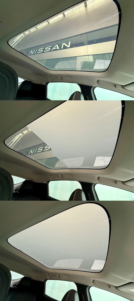 遮熱機能付きの調光パノラミックガラスルーフ(オプション)も魅力的な装備。スイッチ操作で遮光範囲を調整できるのだ。