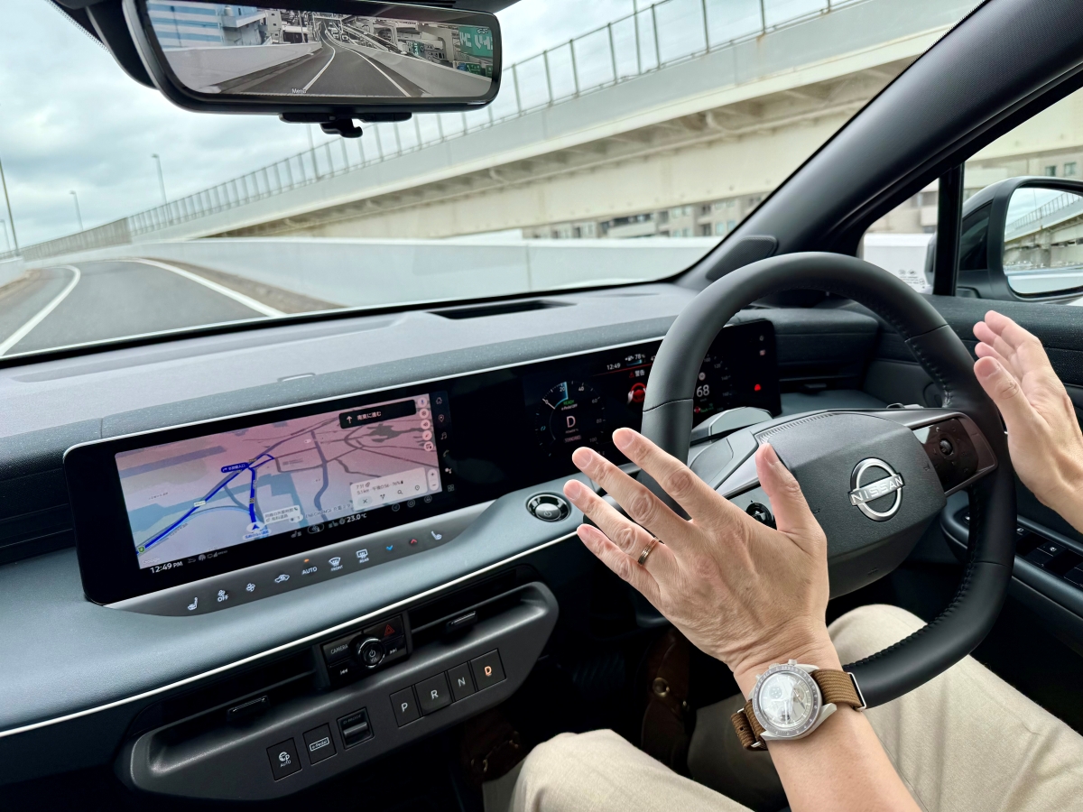 後席は2段階のリクライニングができ、足元にも余裕がある。前席はとくに体の“すわり”がよく、これは一定条件下での手放し運転“ハンズオフ”の状態でもしっかりと体を支えるためだろう。そのハンズオフも、都市高速で試すことができた。新型「リーフ」の特性に合わせたチューニングが施されているそうで、動きがとても自然で安心できる。普通にハンドルを握っている状態でもシステムが極端に介入する感じが気になることはほとんどなかった。