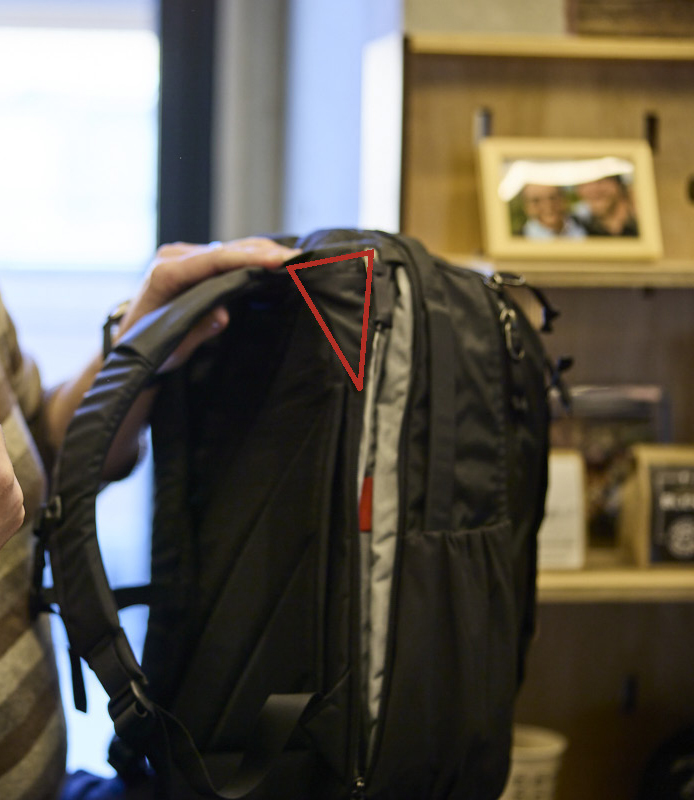 ケビン:人間の体に直線はないですからね。ショルダー上部の三角マチは、背負ったときにできる肩とパックの空間をなくしてくれるんです。パックを肩に引き付けるスタビライザーがないから、見た目にもすっきりしてるでしょ。余分なパーツを付けなくても、快適に背負える──というのもEVERGOODSの特徴なんです。