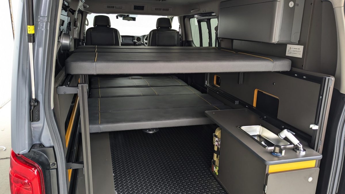 ベース車はキャラバンのGRANDプレミアムGX標準ボディ。乗車定員は5人で、就寝定員は2人となっていますが、オプションの上段ベッドマットにより4人の就寝にも対応しています。