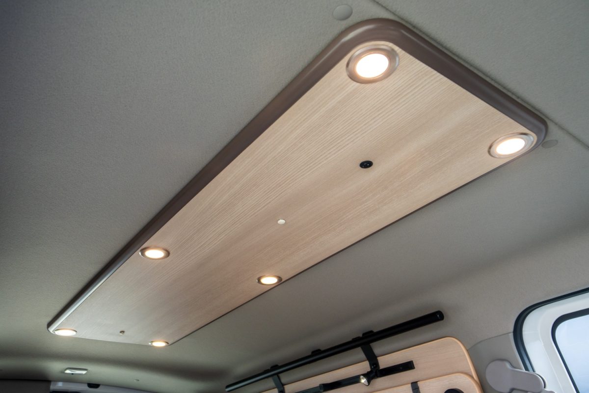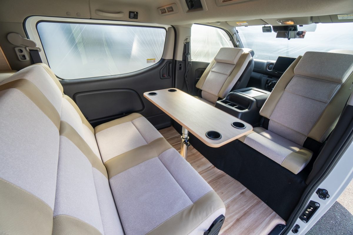 どちらも左リアクオーターウインドウにテーブル収納が行えるほか、天井に飾り板付き照明、右リアクオーターウインドウに家庭用エアコン(オプション)の装備が可能。