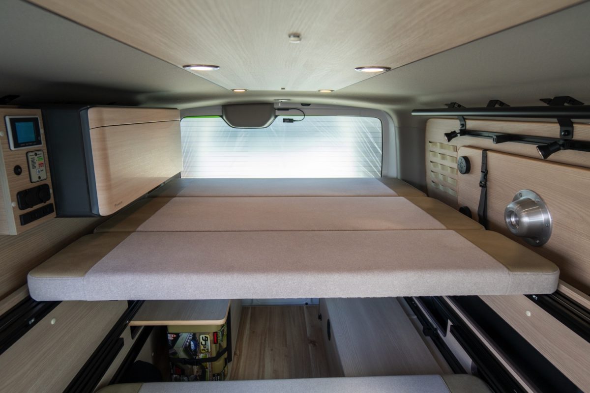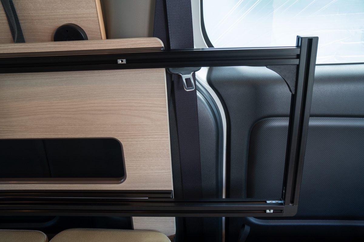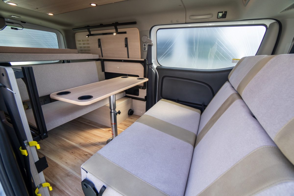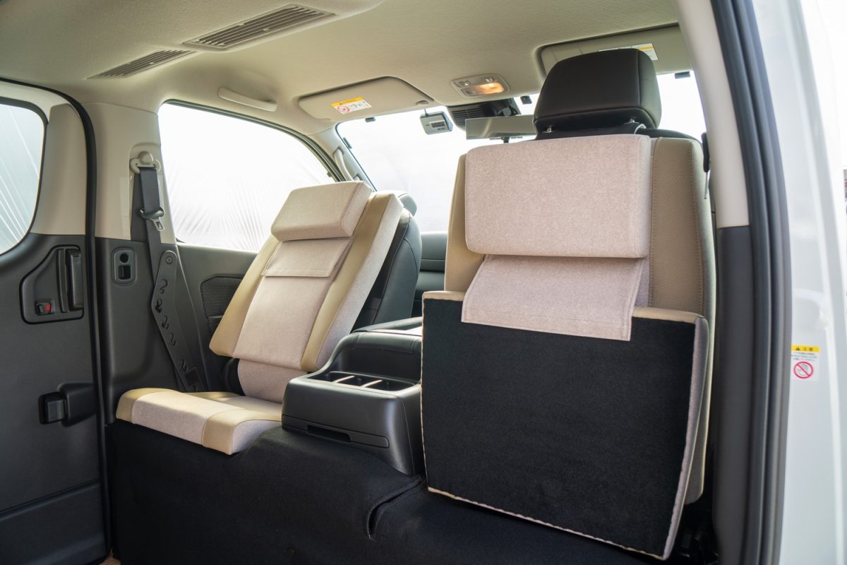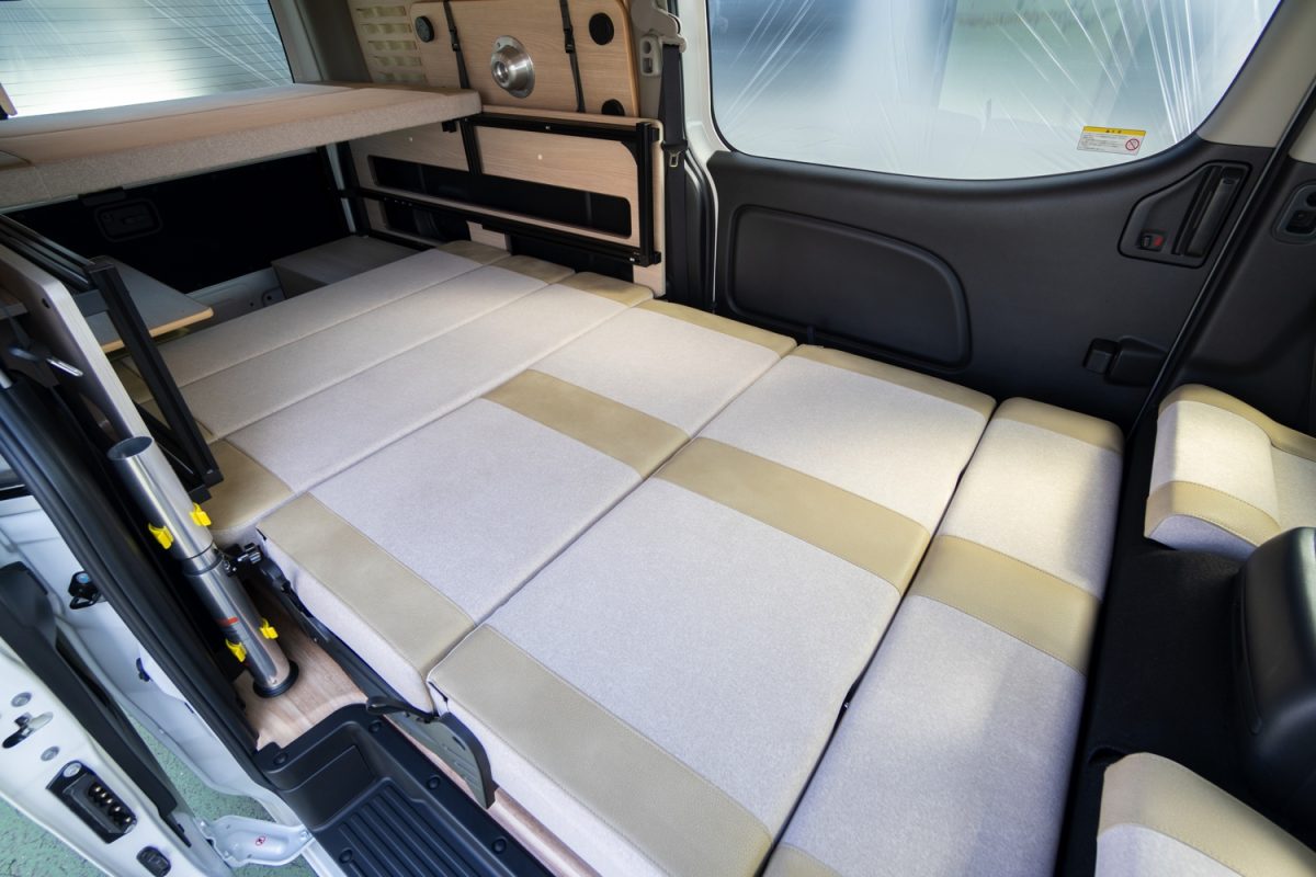 セカンドシートにはキャンピングカー専用の1200mmREVOシートを装備。リビングを展開する際は後ろ向きにしたセカンドシートとベッドマットにより対面対座での利用が可能。さらに面白いのが、このセカンドシートと運転席・助手席の背もたれ背面にオプションのフロントダイネットマットをセットすれば前方側でリビングの展開もできるようになっています。この場合、セカンドシートを反転させるという手間もなく、荷室の広さを確保したまま使えます。