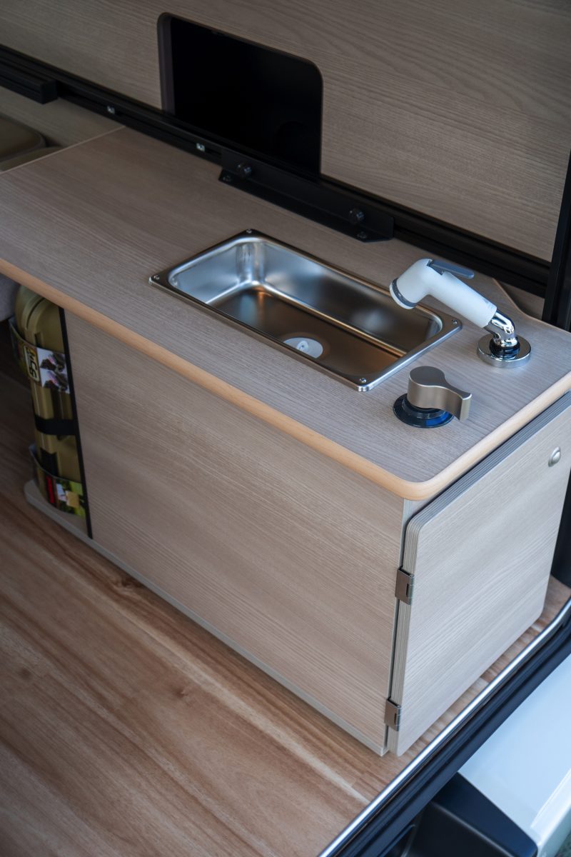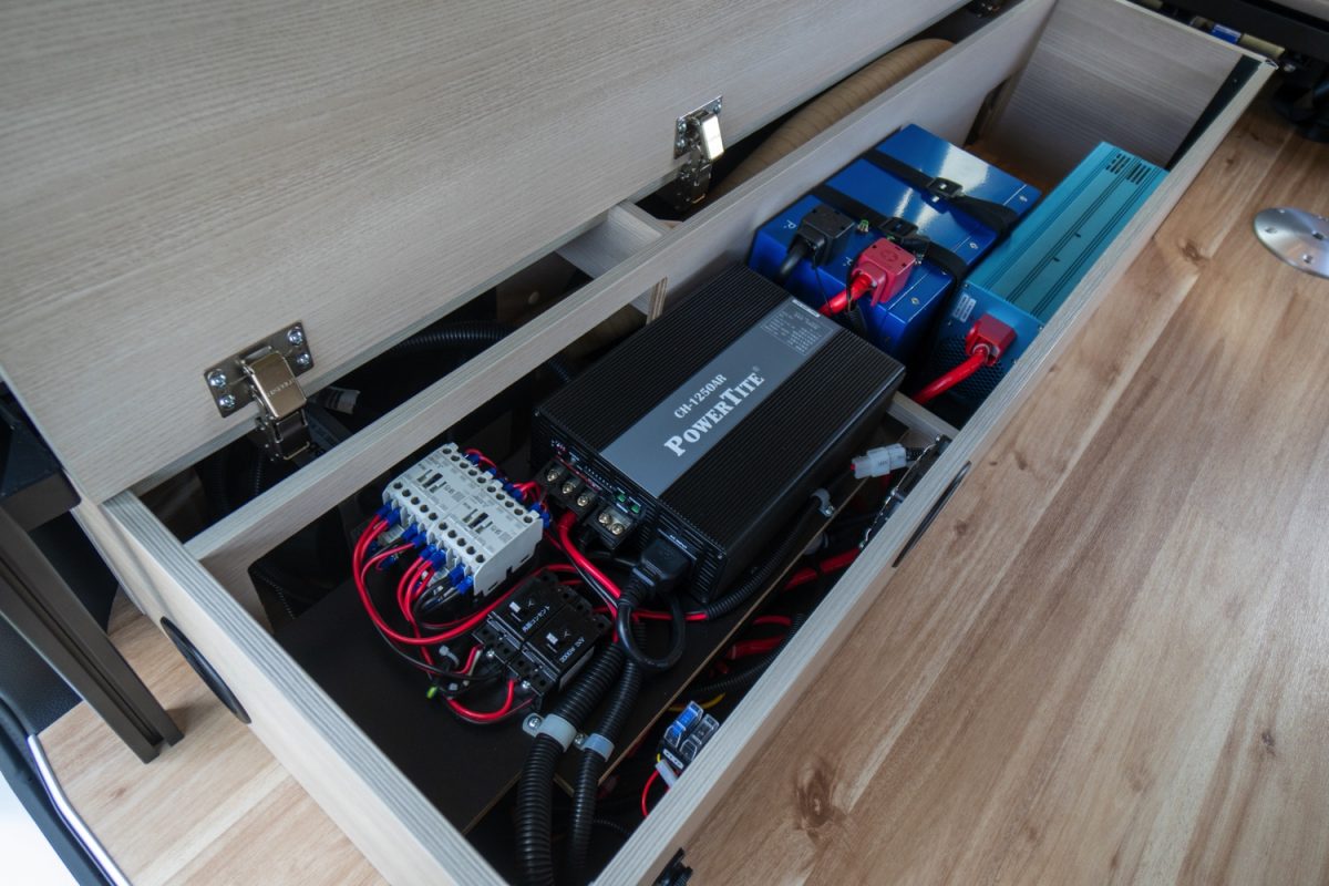 荷室の右キャビネットには水まわりを集約しているほか、電装系についてはポータブル電源と外部電源を利用する想定で外部電源やポータブルバッテリー用給電口を装備。