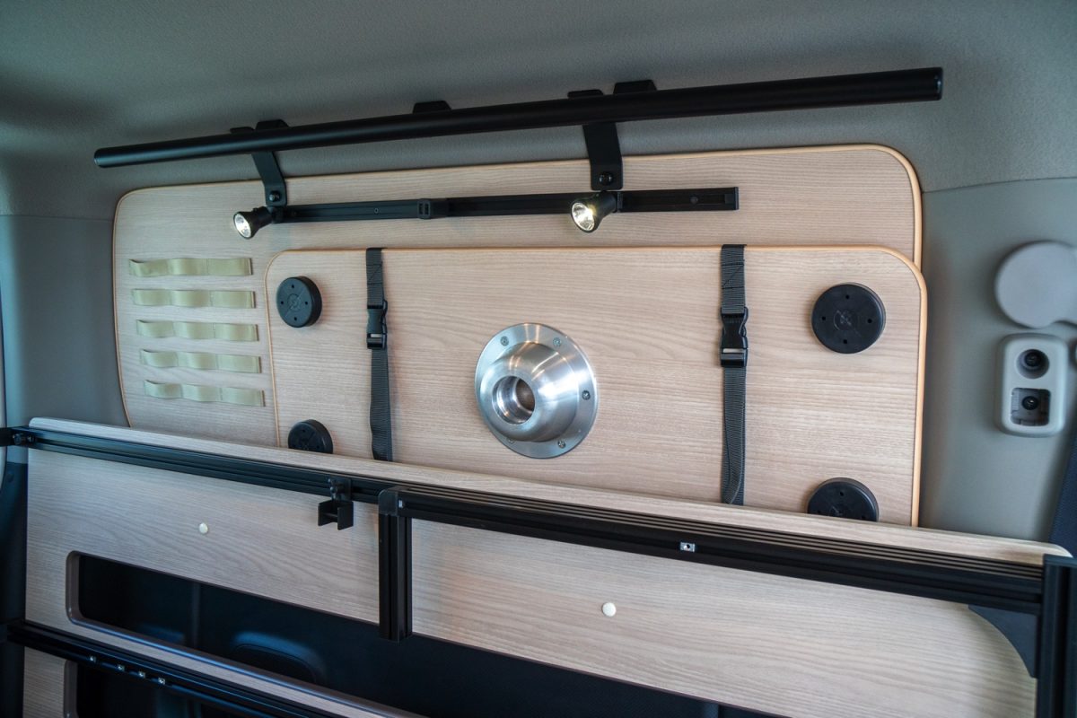 荷室左右の壁にはアイアン製のレールを3本装備。このレールの上にベッドマットをセットしていくのですが、高さが3段階で変更できるようになっており、荷物の量や就寝人数などに合わせて好みに調整できるのはオアシスならでは。