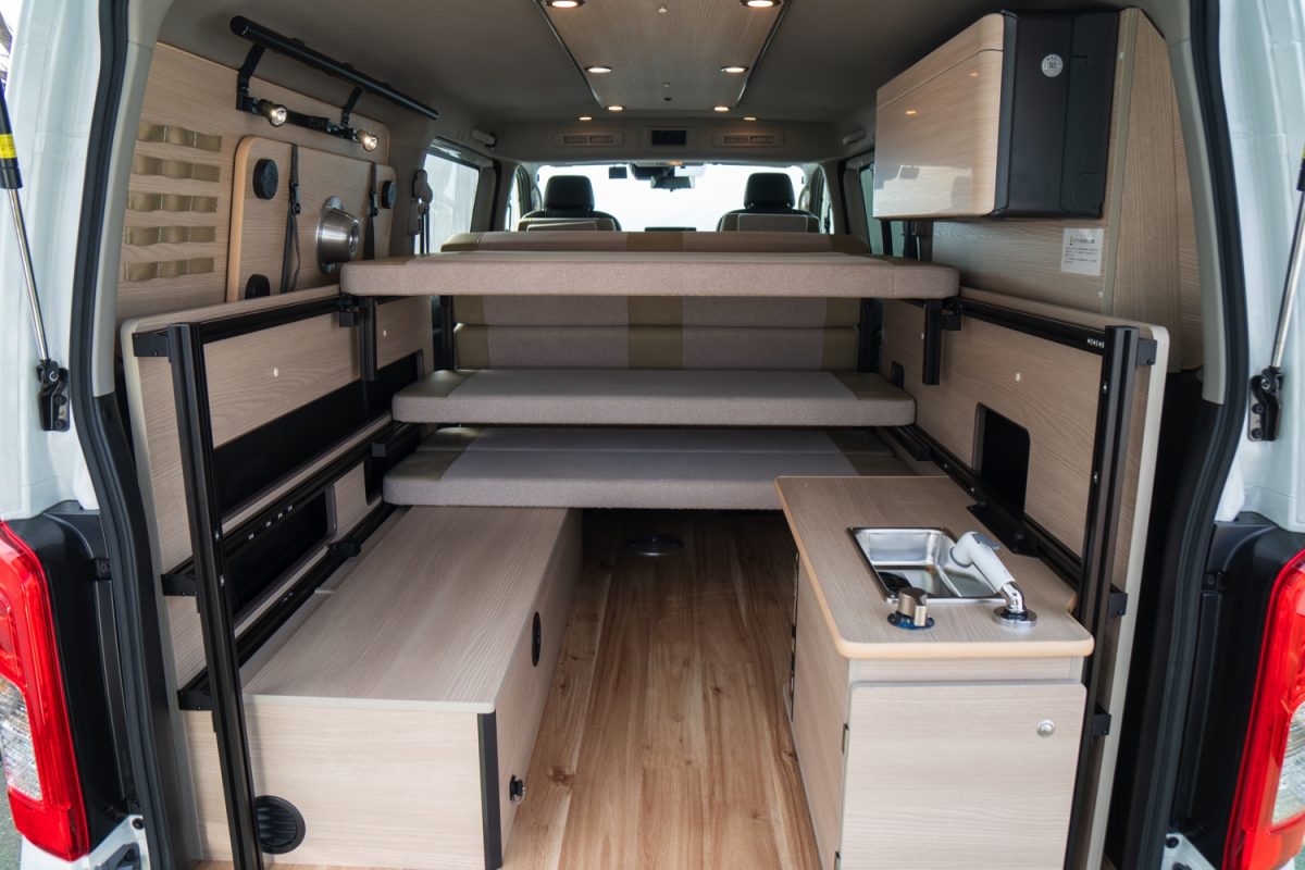 装備に関してはユーザーのスタイルに合わせて、①基本架装(ベッド・家具・床・シンク・照明などキャンピングカーとしての基本装備) 、②基本架装+FFヒーター 、③基本架装+FFヒーター+ホームエアコン、④基本架装+FFヒーター+ホームエアコン+電装パックのバリエーションを用意。①~③まではポータブルバッテリーで電源を供給し、④はリチウムイオンサブバッテリー(150Ah)やインバーター(2000W)などを装備した充実装備仕様になっています。