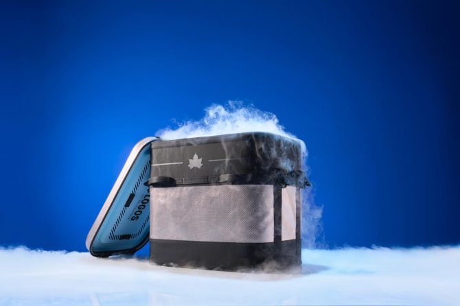 冷蔵庫にも使われている真空断熱パネルの技術を応用した「HUGEL 真空断熱クーラーボックス」。高い保冷力に加え、持ち運びや収納のしやすさなど、使い勝手にも配慮した設計となっている。
