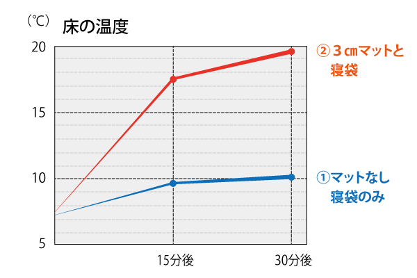 そこで、敷くものを変えながら床付近の温度や体感の違いを確かめてみると、敷物がない場合と比べ、マットを使用した場合は床からの冷気が明らかに抑えられることが判明。上から体を包むだけでなく、下からの冷気を遮断すること。それが、眠れるかどうかを左右する大きなポイントなのだ。